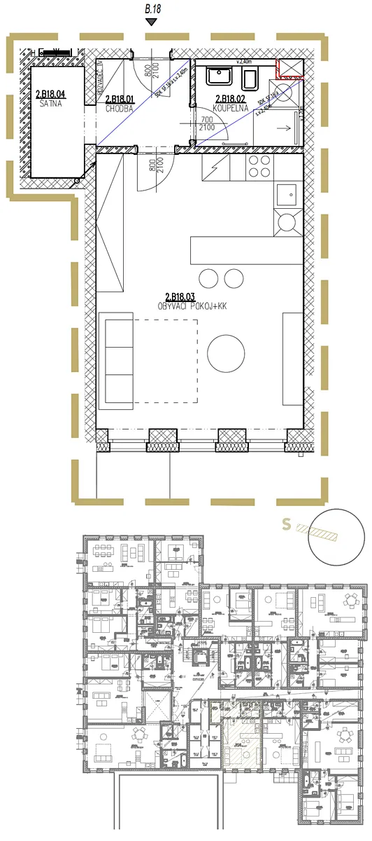 Nabízíme k prodeji prostorný byt B18 o dispozici 1+kk a celkové výměře 40,5 m² dle NOZ (čistá užitná plocha 38,7 m²). Byt se nachází 2. podlaží a je orientován převážně na západ. Jedná se o prostorné 1kk se samostatnou šatnou a samozřejmě i vč sklepní kóje o velikosti 2,7 m². Cena zahrnuje i parkovací stání – vše je uvedeno včetně DPH.