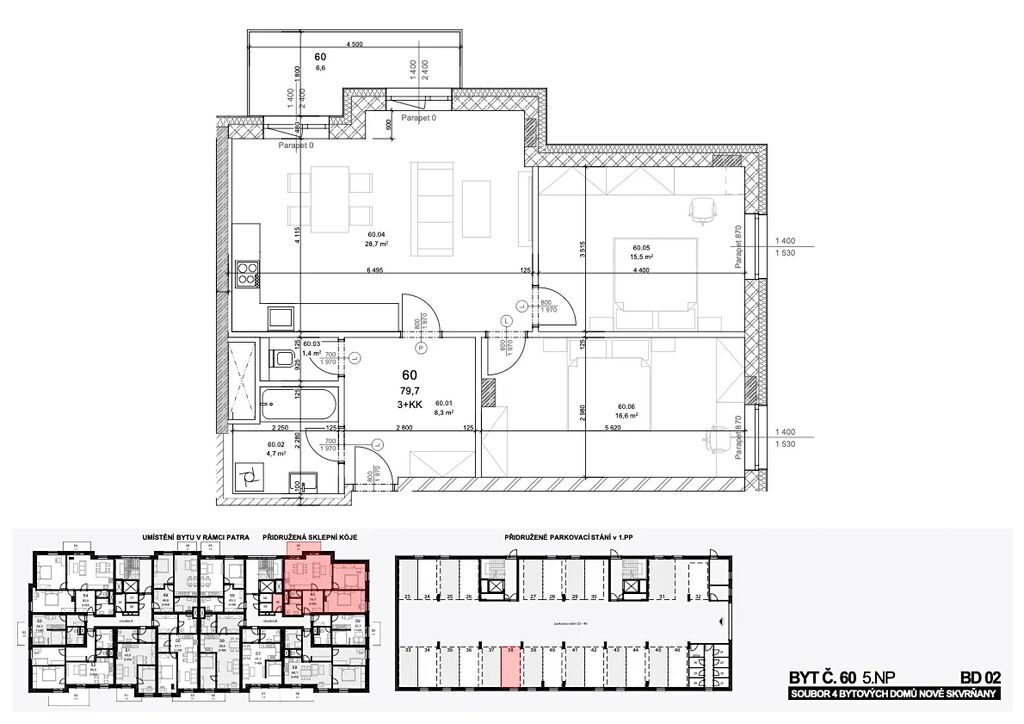 K bytu je možno dokoupit parkovací místo umístěné v prvním podzemním podlaží.