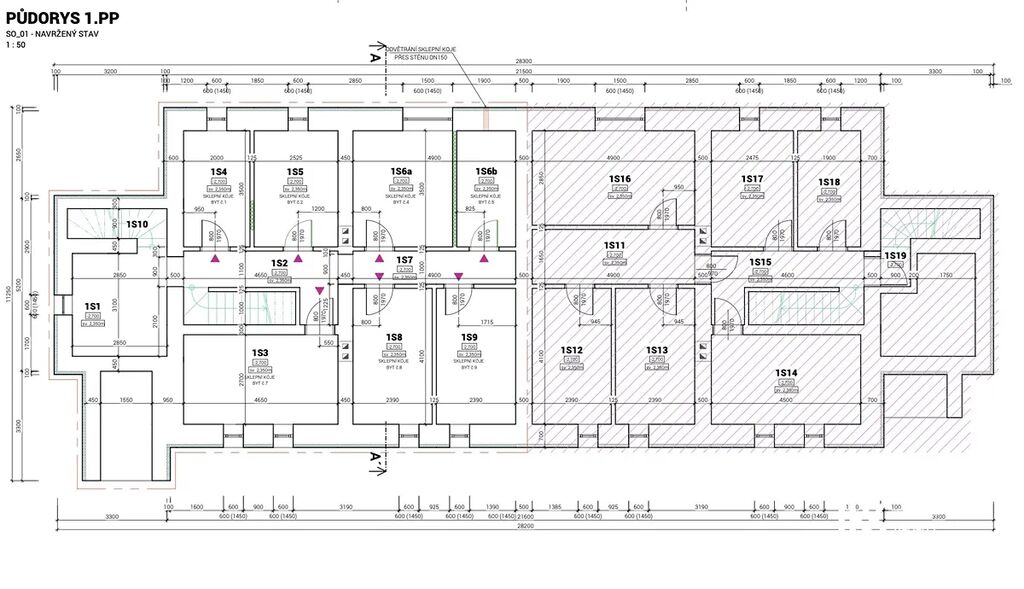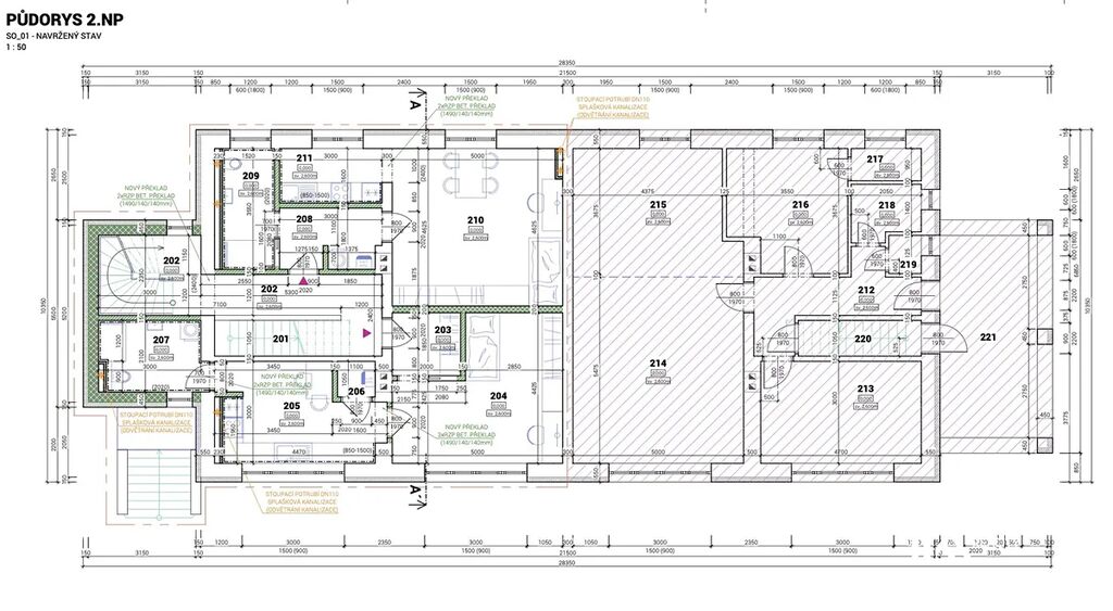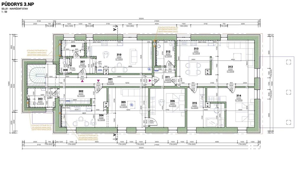 V galerii ukazujeme současný příkladový projekt, který můžeme v rámci prodeje poskytnout. Tento projekt je však vhodné přepracovat s cílem efektivnějšího využití prostoru (nové půdorysy bytových jednotek apod.) a zajištění maximalizace výnosu investice.