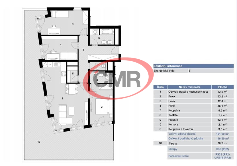 Byt disponuje neprůchozími pokoji (každý se vstupem na terasu), které zaručují maximální komfort. V rámci dispozice naleznete dvě prostorné koupelny (jedna pouze u ložnice) a dvě toalety, takže se zde pohodlně vyrovnáte i s potřebami větší rodiny nebo hostů. Šatna nabízí dostatek úložného prostoru pro vaši módu a doplňky.