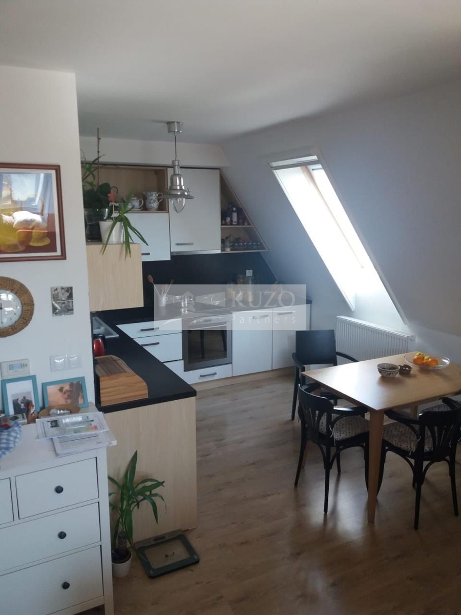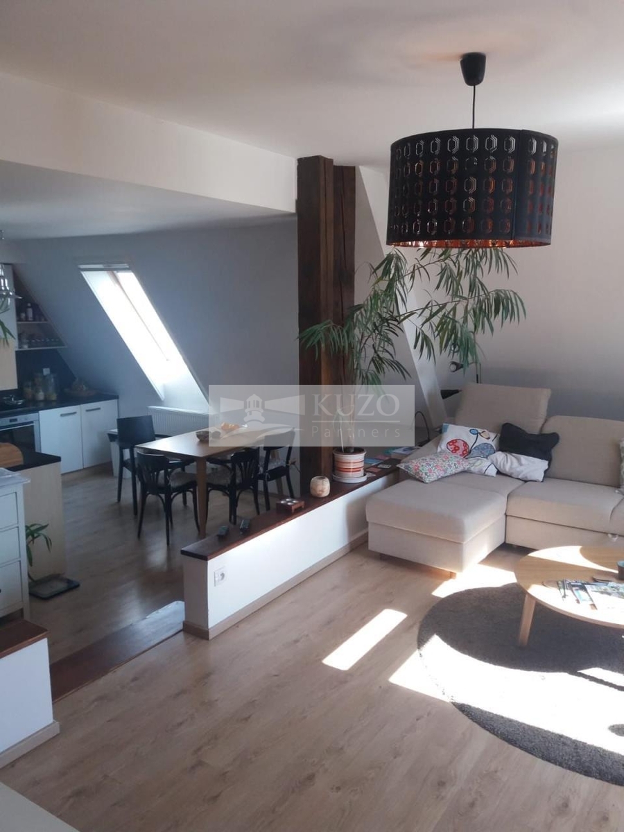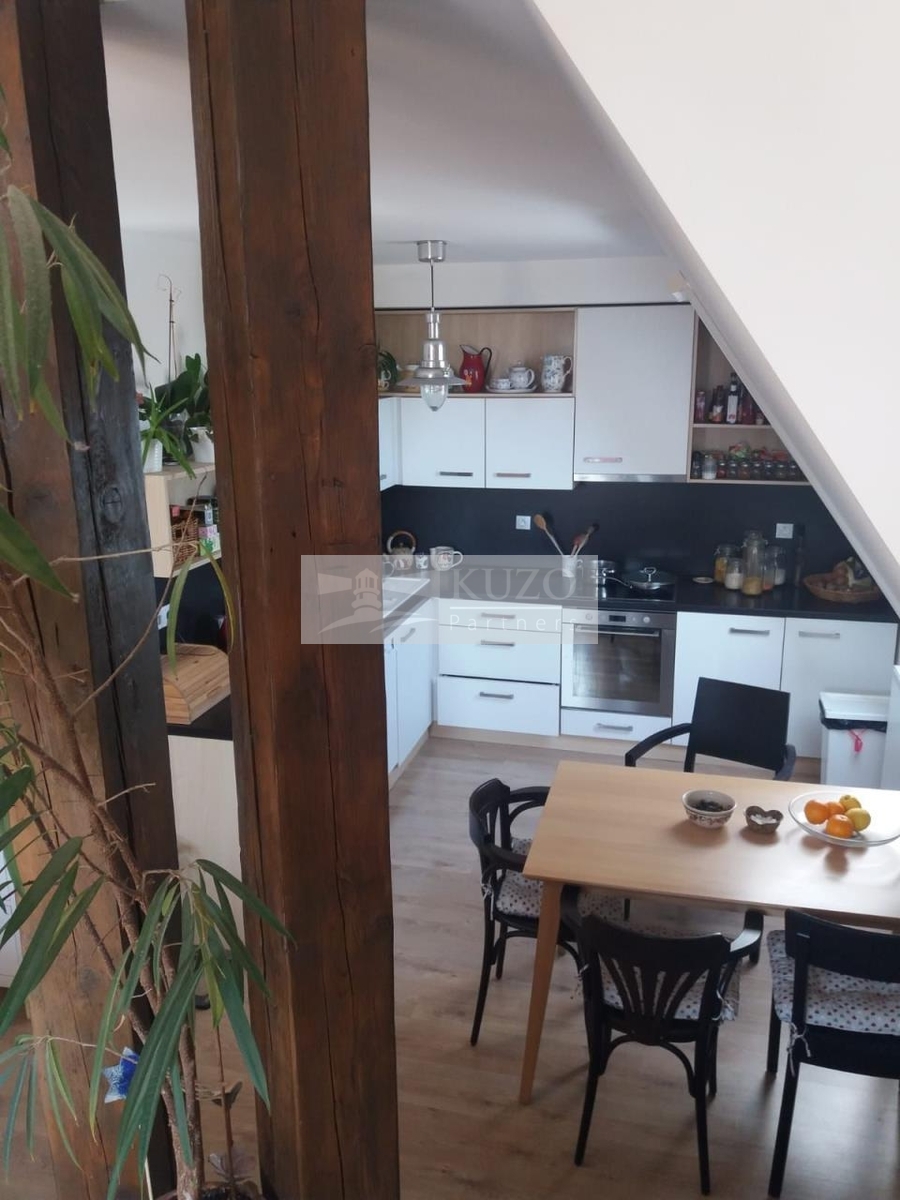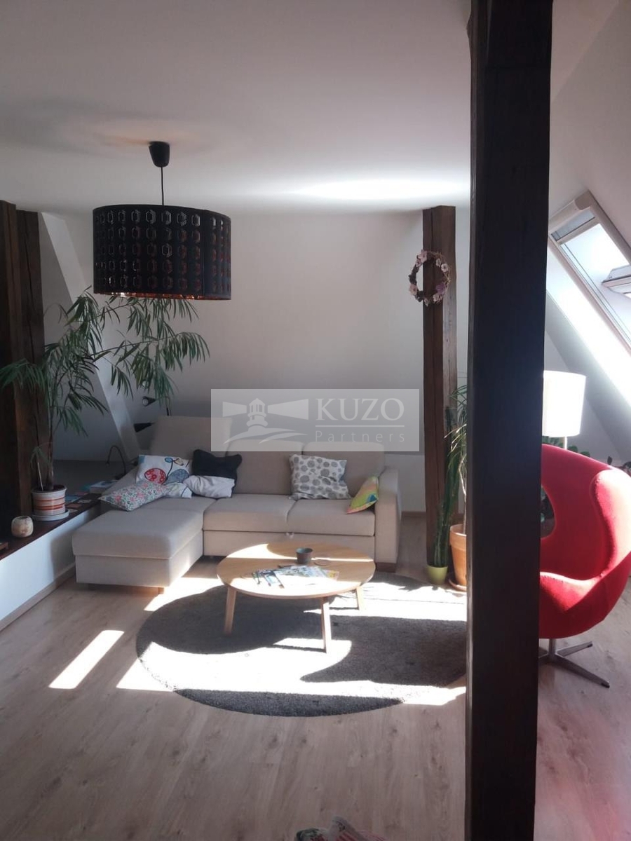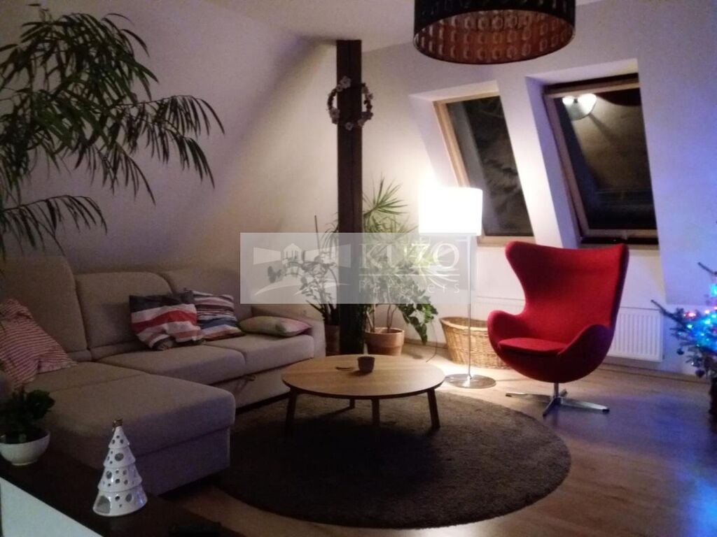 Jedná se o atypický podkrovní byt s kouzelnou atmosférou, pro jednoho nebo pro dva. V domě je jen 9 bytů a rodinná atmosféra. Klidná lokalita u malebného nádraží, v mírném kopečku. V bytě je plynový kotel Buderus - k ohřevu vody a topení, kuchyňská linka se spotřebiči, velmi úložné šatní skříně na míru, klimatizace a ve střešních oknech sítě proti hmyzu a roletky. V koupelně je velká rohová vana. Kouzelnou atmosféru dodávají přiznané dřevěné trámy. K bytu náleží jedno venkovní stání na auto.