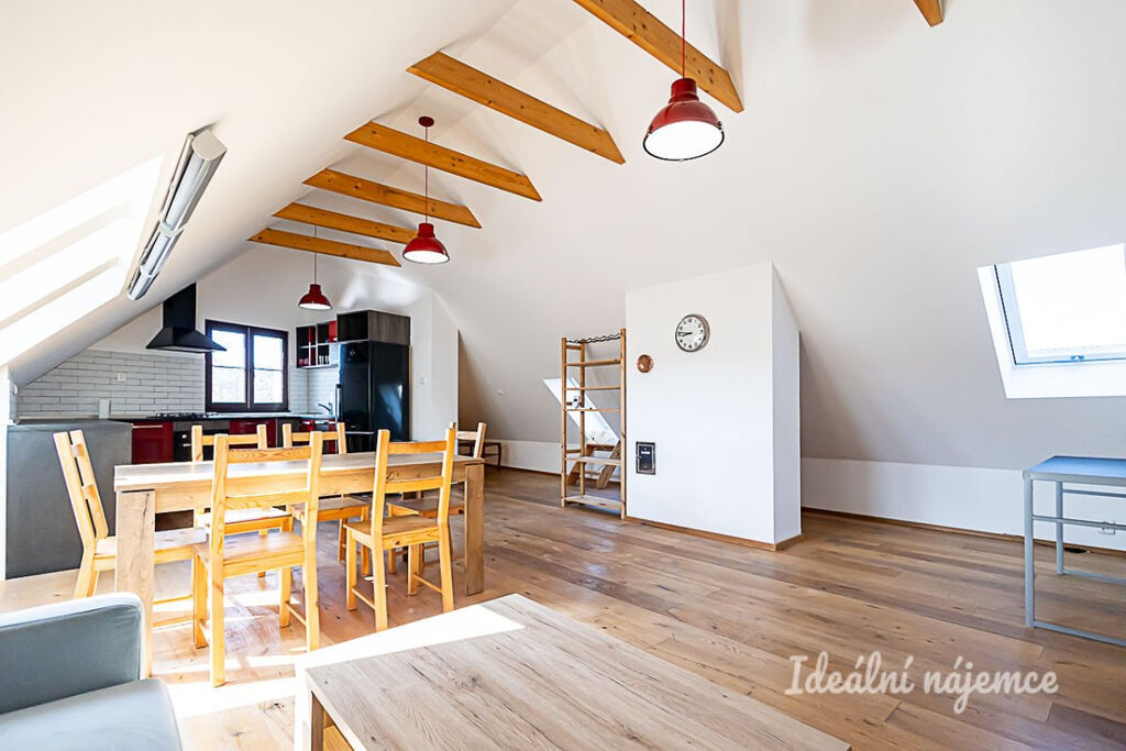 K dlouhodobému podnájmu nabízíme prostorný a světlý podkrovní byt 4+kk o velikosti 140 m², který se nachází v nejvyšším, 3. patře udržovaného bytového domu bez výtahu, v klidné lokalitě Praha 4 – Braník. K bytu přísluší balkon (8 m²), terasa (10 m²), sklep (12,1 m²) a garáž (19,5 m²).
