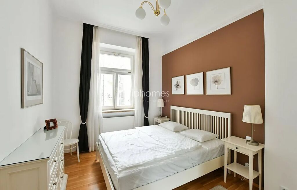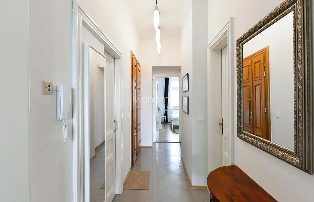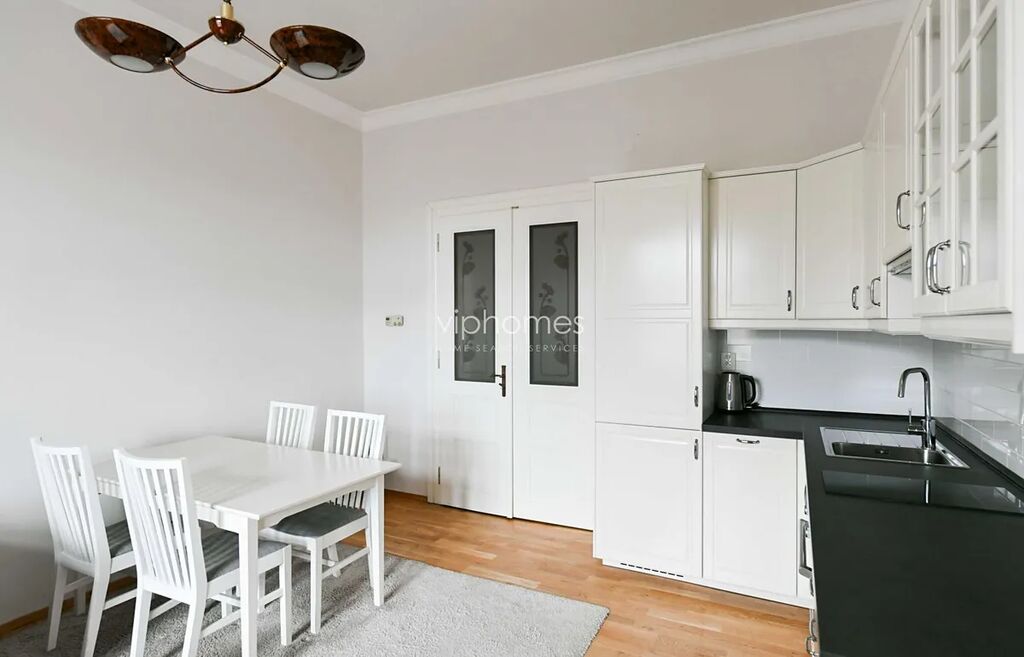 Vysoké stropy, zachované původní prvky, parkety, dlažba, bezpečnostní dveře, pračka, sušička, TV, videotelefon, bezpečnostní zařízení. Satelitní anténa s programy dle přání klienta. Byt je zařízen nábytkem, lze pronajmout i nezařízený. K dispozici ihned.