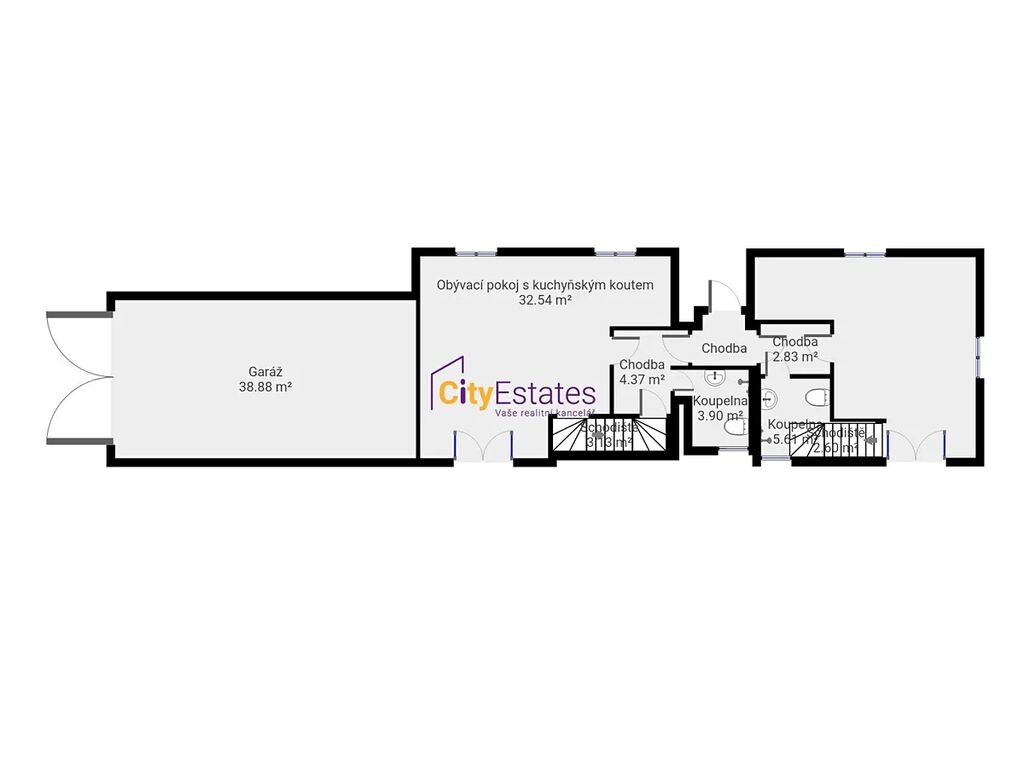 Byt má podlahovou plochu 77m2, největším pokojem je obývací pokoj s kuchyňským koutem o výměře 25,6 m2. V přízemí se ještě nachází koupelna s toaletou. V patře jsou dvě ložnice.