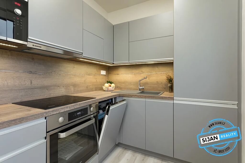 Moderní kuchyně včetně spotřebičů - vestavná mikrovlnka, elektrická trouba s Wi-Fi ovládáním přes telefon, indukční sklokeramická deska, digestoř, myčka, vestavná lednice a mrazák, fragranitový dřez, kuchyňská baterie se sprškou. Koupelna je společná s toaletou, prosklený sprchovací kout, umývadlo se skříňkou a prostor na pračku s horním plněním. Podlahy jsou bez přechodových lišt v jedné úrovni a stejného vzhledu, LED stropní osvětlení do sádrokartonových stropů, vchodové bezpečnostní dveře. Byt je ve zbylých dvou pokojích nezařízený, ale je připraven pro nového podnájemníka.