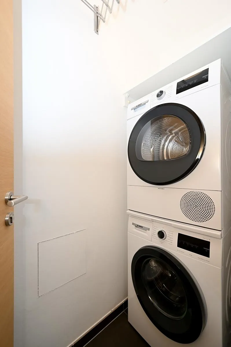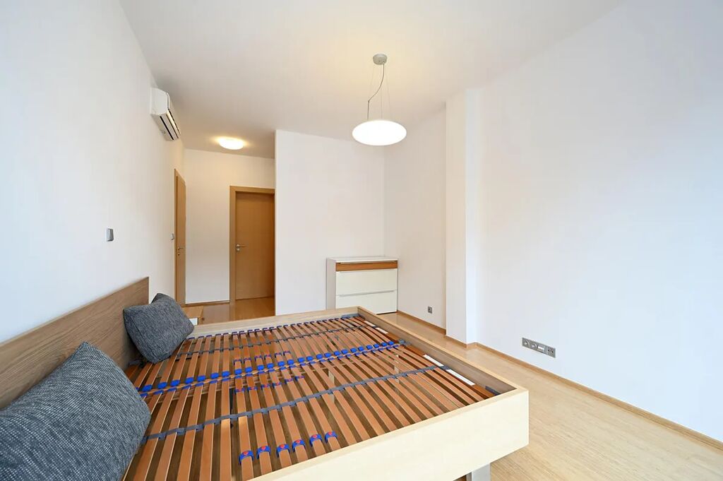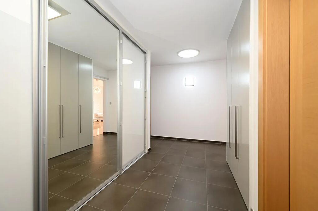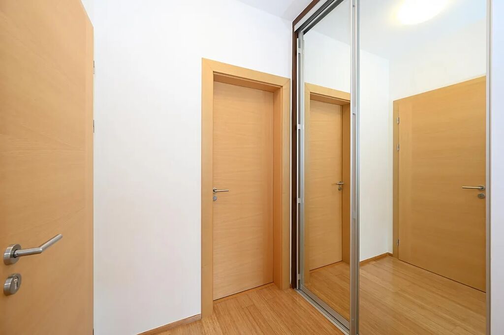 Jižní orientace prostorného a velmi tichého bytu v klidném domě s recepcí 24/7. Ve všech oknech vnější elektrické rolety. Dřevěné podlahy. Zcela nové spotřebiče: pračka, sušička, lednice s mrazákem. Tři minuty pěšky na metro. V okolí krásné parky.