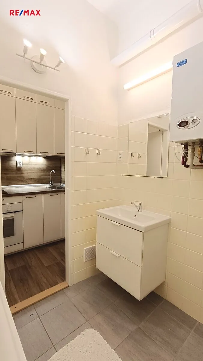 Byt se sestává z obývacího pokoje, malé kuchyňky, koupelny s WC, předsíně a komory. Byt je z roku 2022 po rekonstrukci, s novou kuchyňskou linkou, novými spotřebiči, nové podlahové krytiny a vnitřní dveře, nová elektroinstalace a rozvody vody a odpadu. Byt je vytápěn radiátory, napojenými na plynový kondenzační kotel s průtokovým ohřívačem vody.