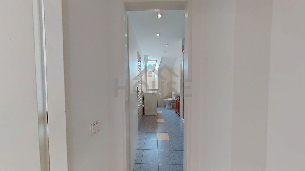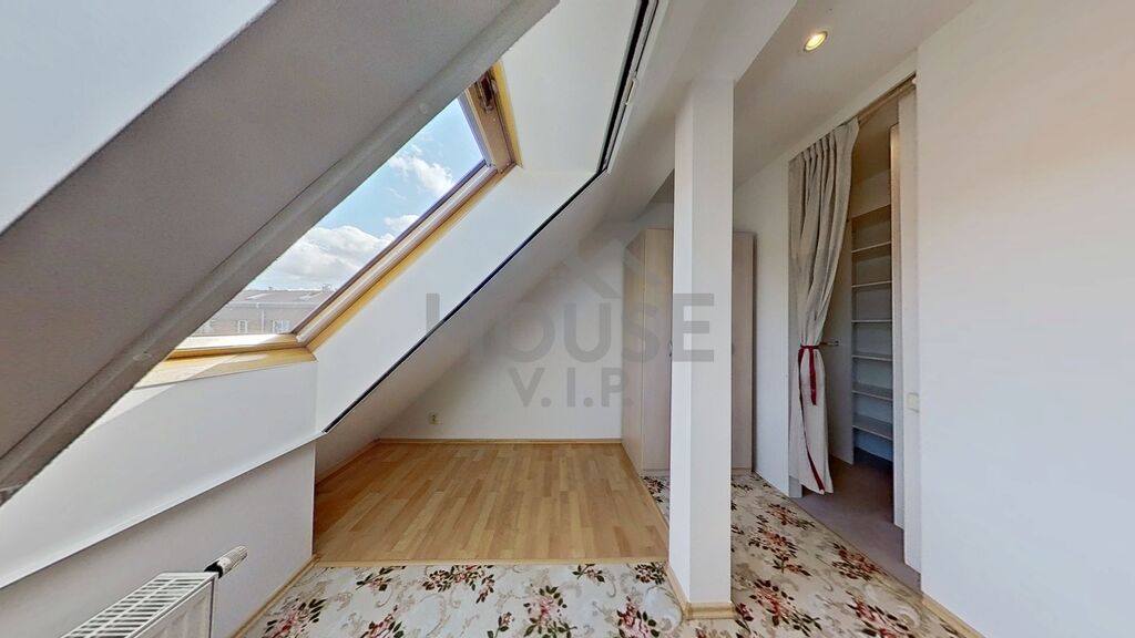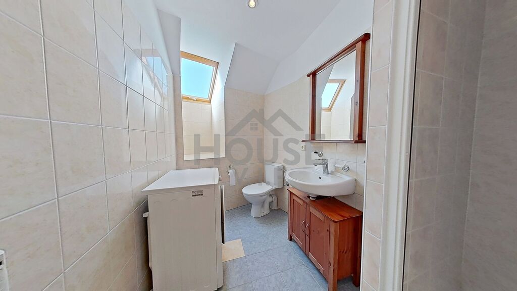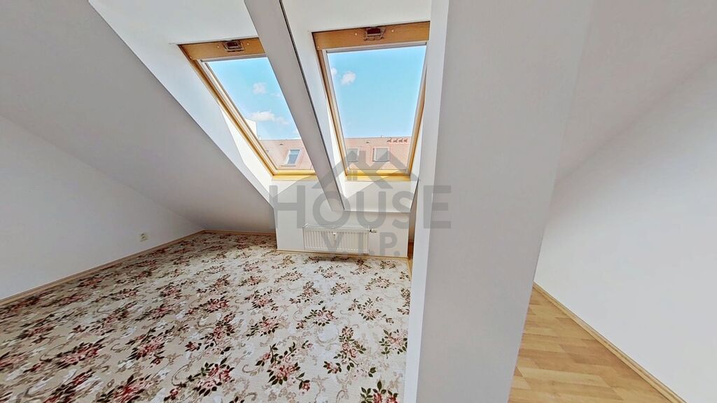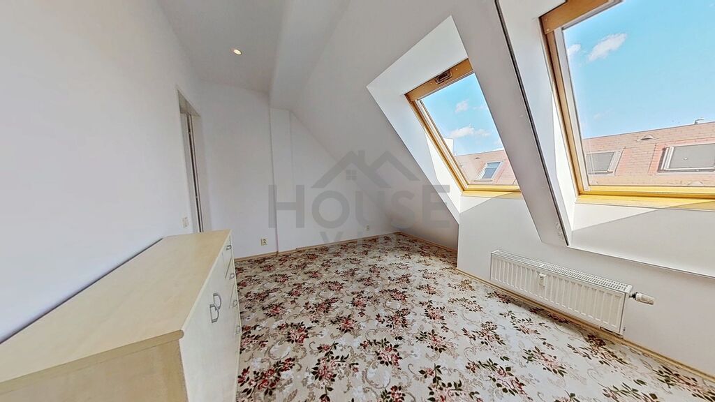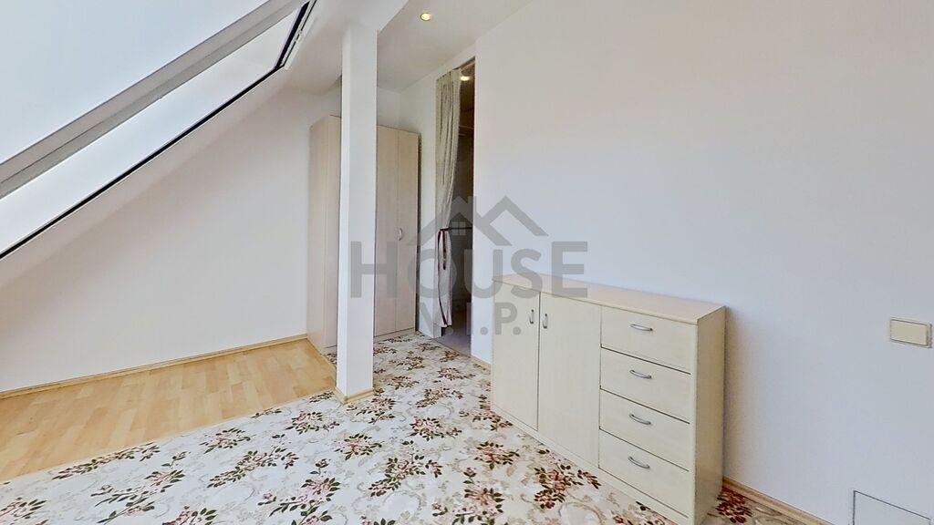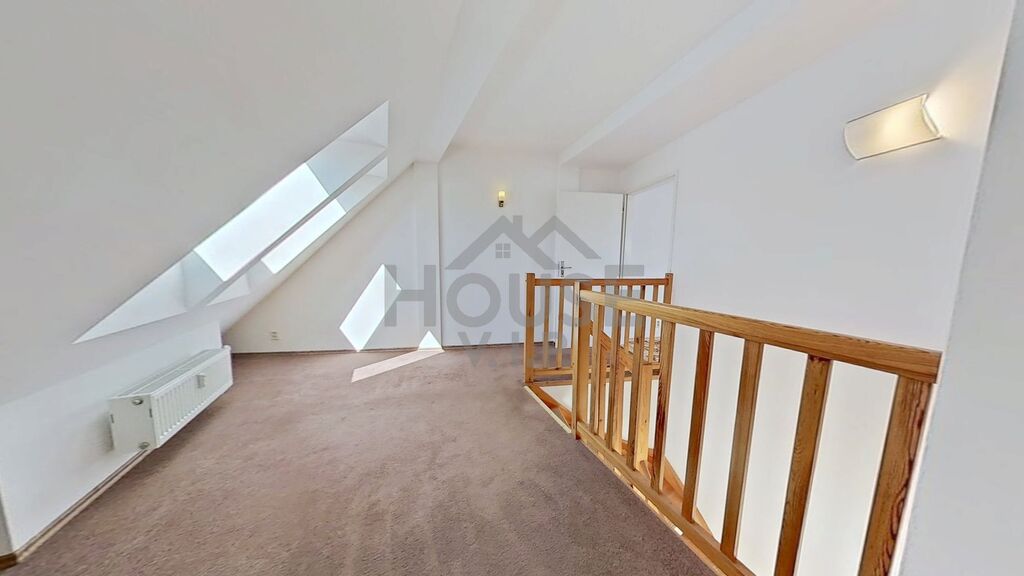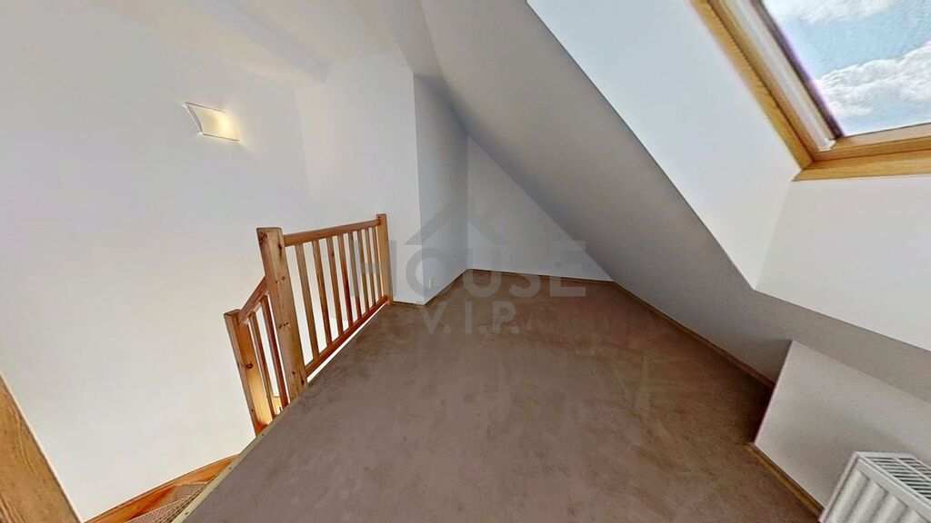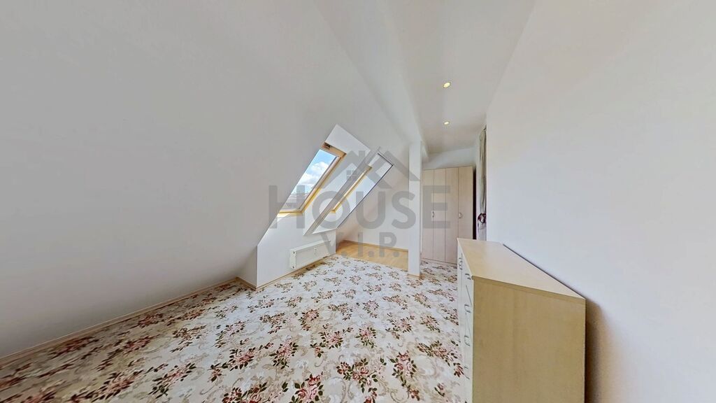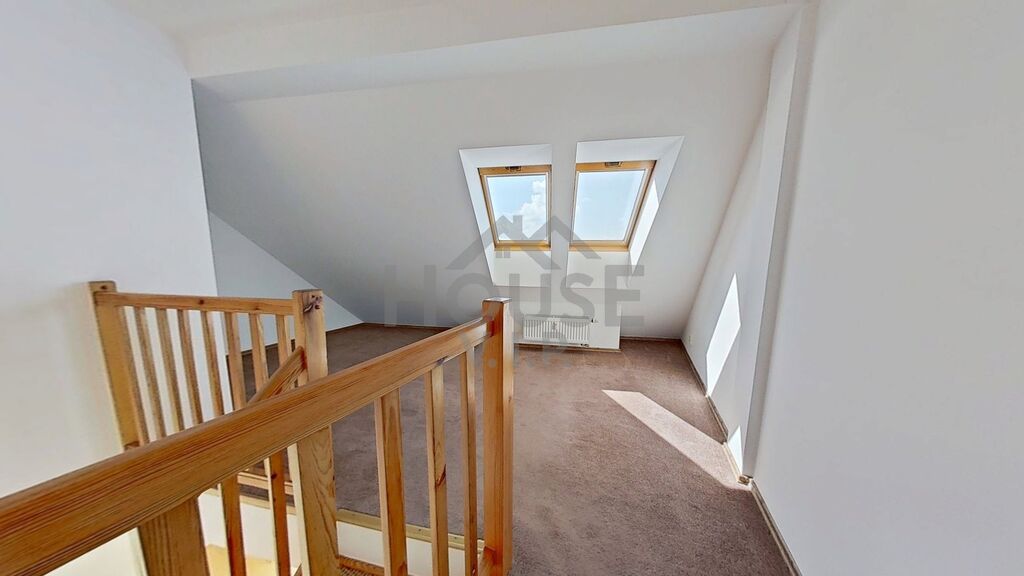 Dispozice nabízí obývací pokoj s kuchyňským koutem a balkonem, ze kterého si vychutnáte ranní kávu i večerní klid. V horním patře jsou dva pokoje a samostatná šatna – praktický prostor, který usnadní organizaci domácnosti a přinese více prostoru do obytných místností. Jeden z pokojů je průchozí, takže ho lze využít jako pracovnu nebo útulný kout pro hosty.