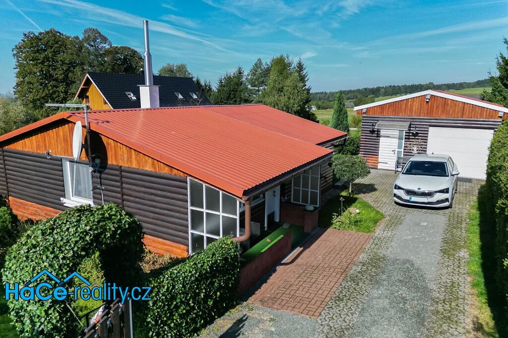 Chata disponuje terasou s výhledem do okolní zeleně, ideální pro sváteční snídaně. Dvě parkovací místa a garáž zajišťují pohodlné parkování.