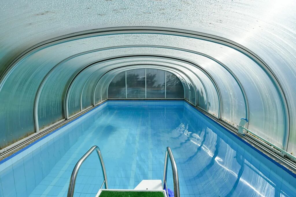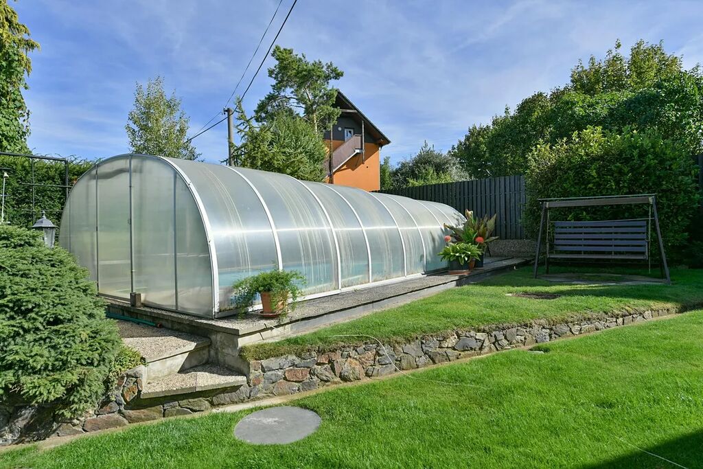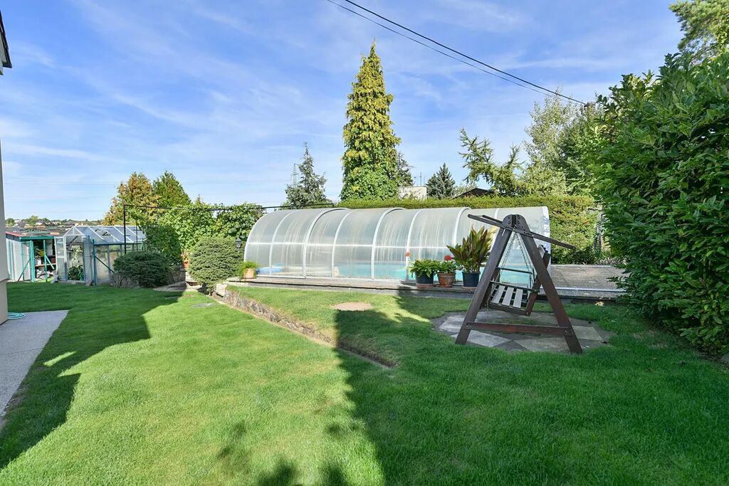 Velkorysá zahrada (1 350 m²) poskytuje dostatek soukromí a na jižní straně nemá přímé sousedy. Krytý a vyhřívaný bazén je využitelný od jara až do podzimu.