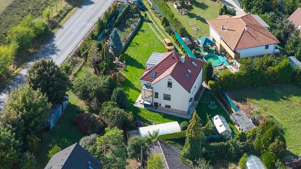 Jen pár minut od Prahy, se nachází tento pěkný rodinný dům s dispozicí 6+kk a užitnou plochou 127 m2 (celková plocha 202,5 m2), udržovaná rozlehlá zahrada o ploše 1 350 m2 s jezírkem, skleníkem a krytým bazénem.