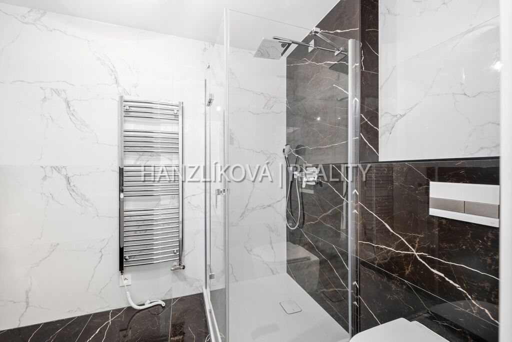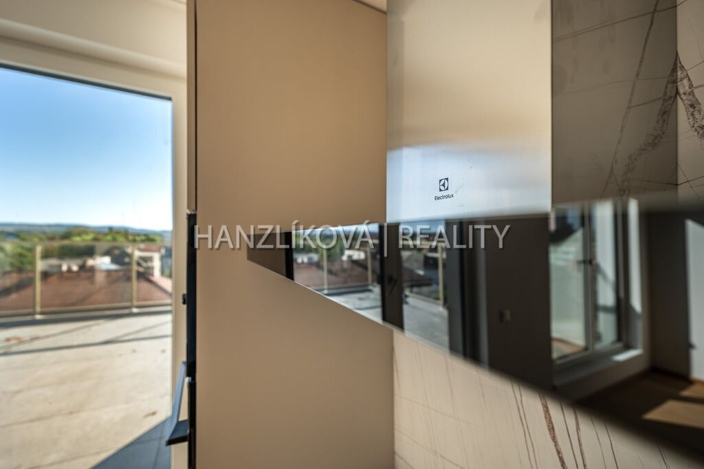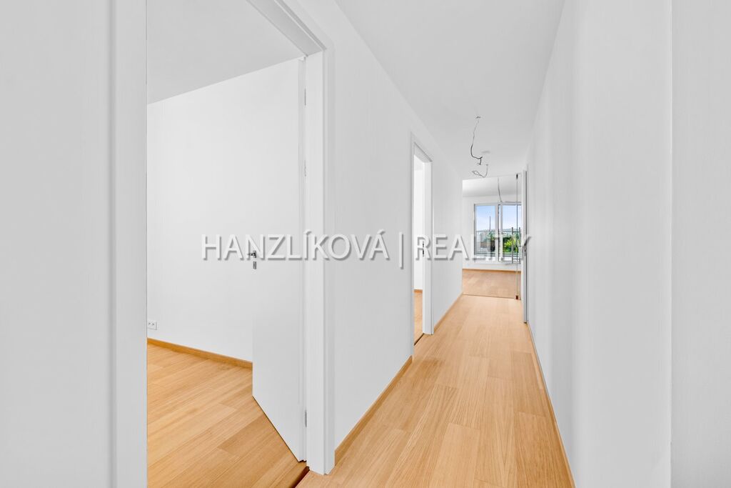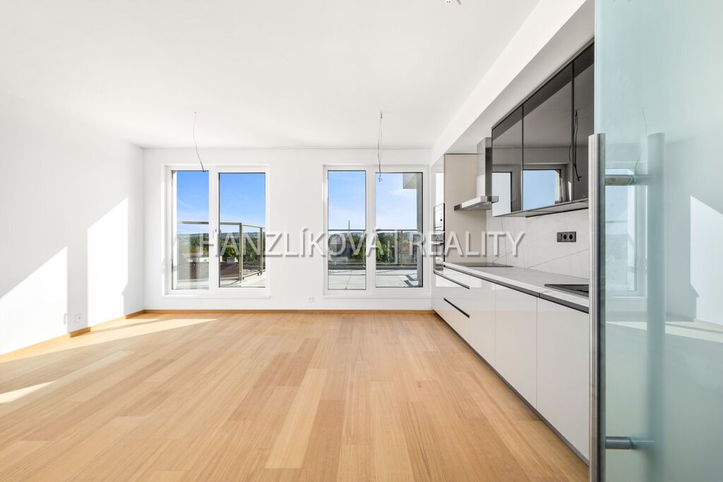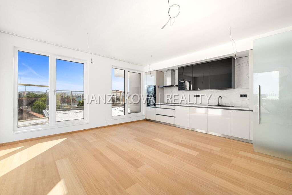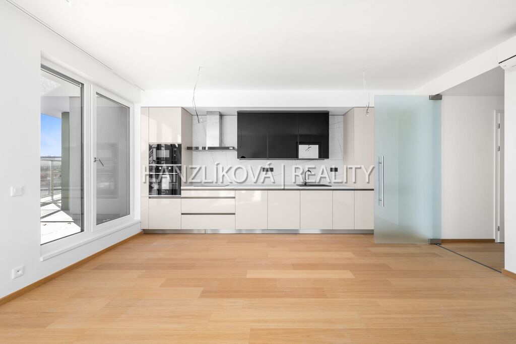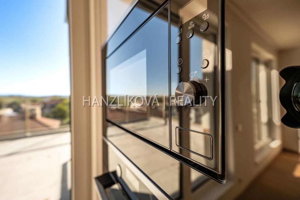 Byt je částečně vybaven – kuchyňská linka na míru od kuchyňského studia Hanák včetně značkových elektrospotřebičů, osvětlení ve všech místnostech, klimatizační jednotky, předsíňová stěna, předokenní venkovní žaluzie.