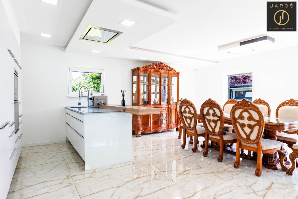 Dominantou přízemí je otevřený obytný prostor propojující elegantní skleněnou kuchyň na míru se spíží, prostorný jídelní kout a příjemný obývací pokoj, kde je možné umístit krbová kamna. Přímé propojení se zimní zahradou a se zahradou vytváří plynulé propojení interiéru s exteriérem. V přízemí dále naleznete pokoj pro hosty, pracovnu, velkou šatnu, technickou místnost s prádelnou a nadstandardní koupelnu vybavenou vířivou vanou, sprchovým koutem, toaletou, bidetem a pisoárem. Součástí domu je i prostorná garáž pro tři automobily s přímým vstupem do domu.