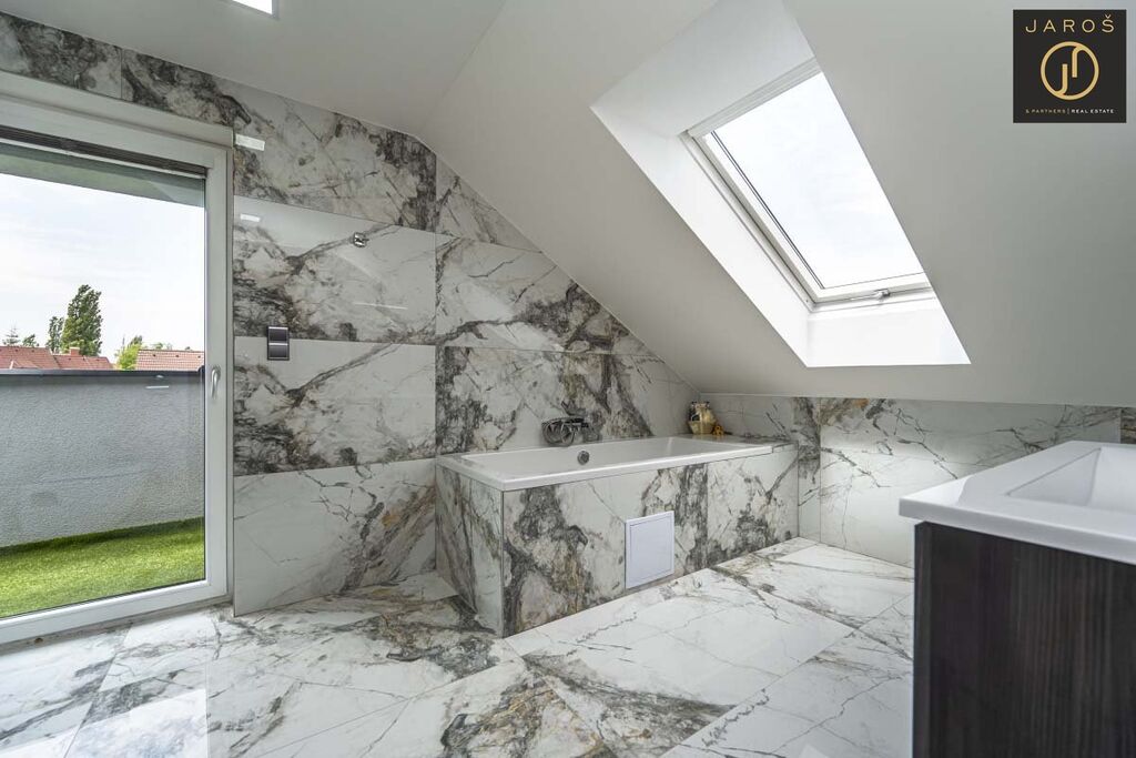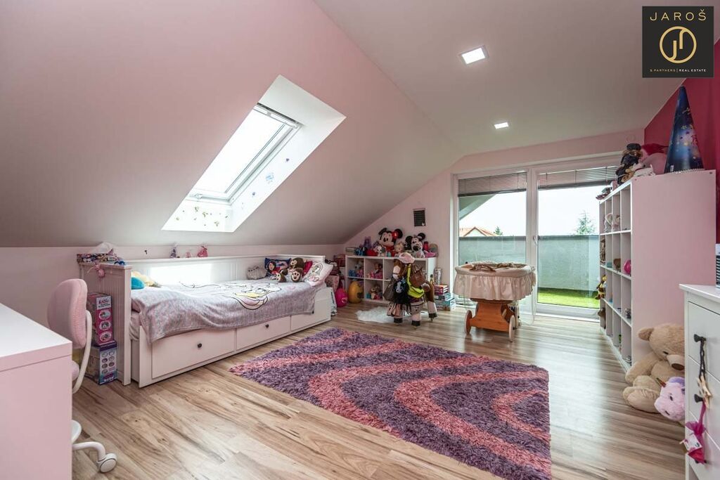 V patře se nachází hlavní ložnice s vlastní šatnou, dva další samostatné pokoje, koupelna s vanou a přístup na nádhernou soukromou terasu, která poskytuje klidné útočiště a výhled do zeleně. Každý detail domu byl pečlivě promyšlen tak, aby odpovídal potřebám i těch nejnáročnějších klientů – od podlahového vytápění, centrálního vysavače až po kvalitní materiály a designové prvky.