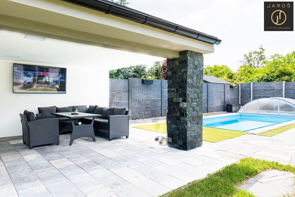 Zahrada nabízí absolutní soukromí díky kompletnímu oplocení. V zadní části se nachází stylový zahradní domek s venkovní kuchyní a krytým posezením, ideální pro letní večery s rodinou nebo přáteli. Nechybí ani vyhřívaný bazén se slanou vodou a zastřešením, vířivka a dostatek prostoru pro relaxaci i zábavu.
