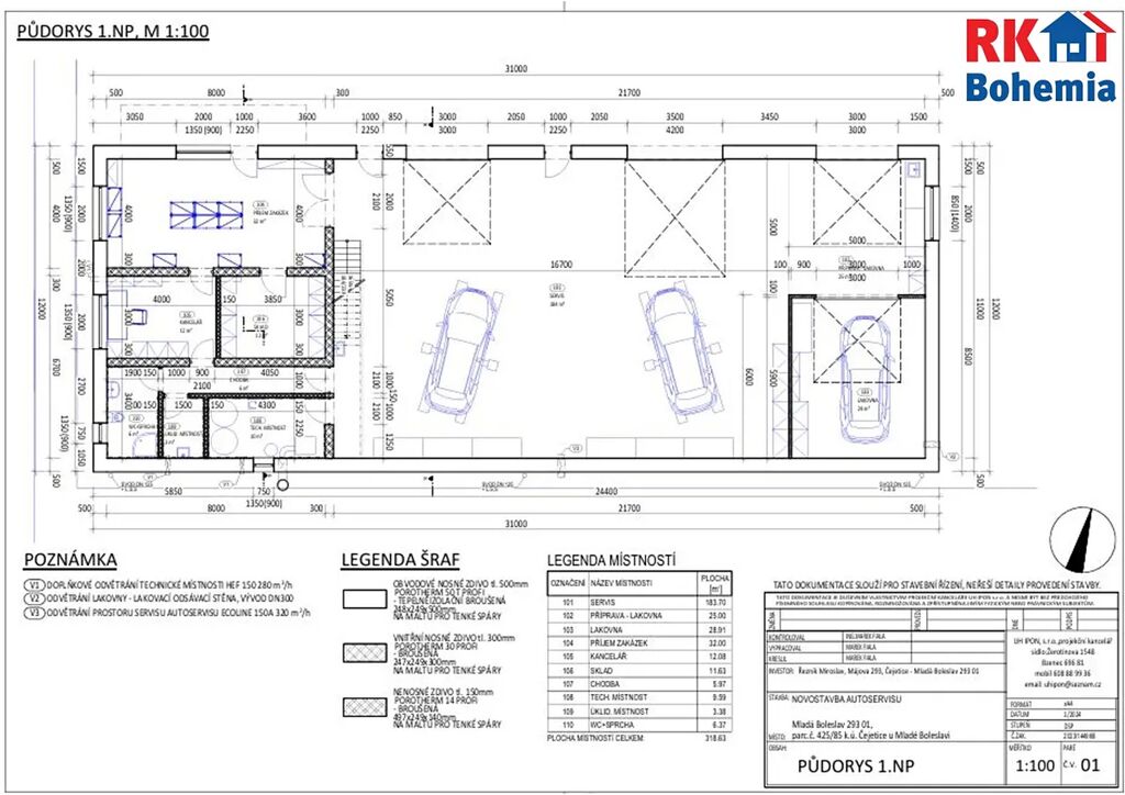 Součástí prodeje je kompletní projektová dokumentace a platné stavební povolení. Objekt je navržen jako moderní servisní centrum se zázemím, přesné dispoziční řešení je k dispozici dle přiložených podkladů.