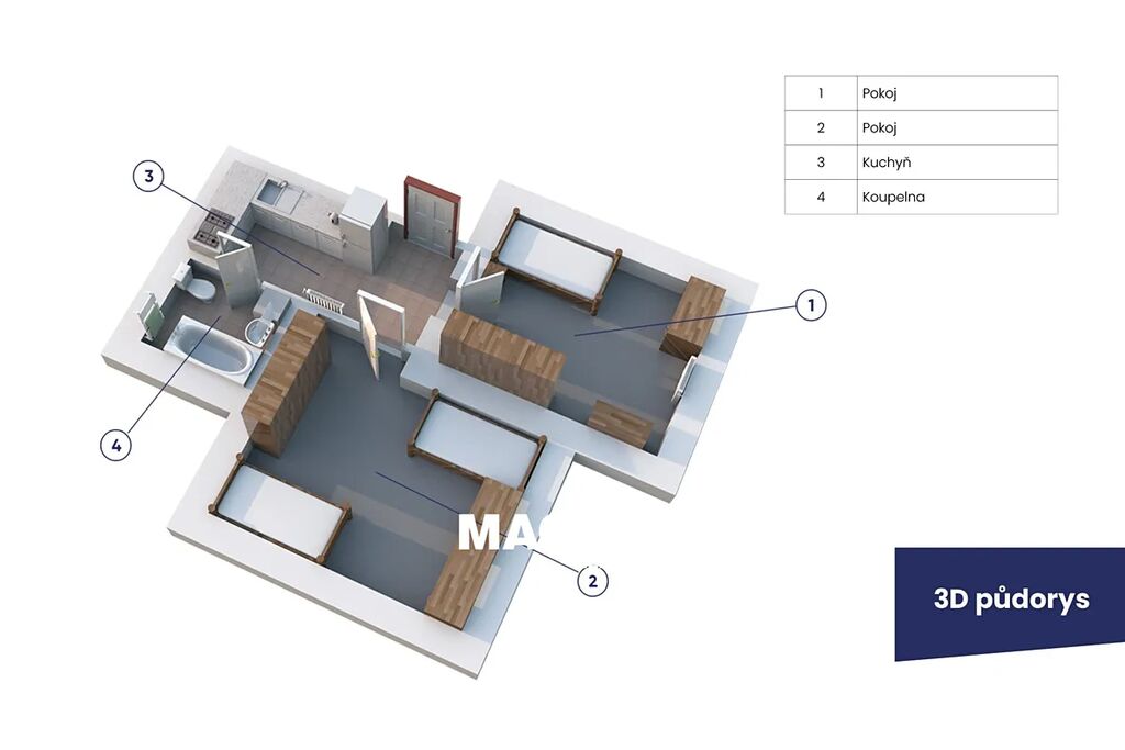 - ideální pro studentské sdílené bydlení (2 neprůchozí pokoje),