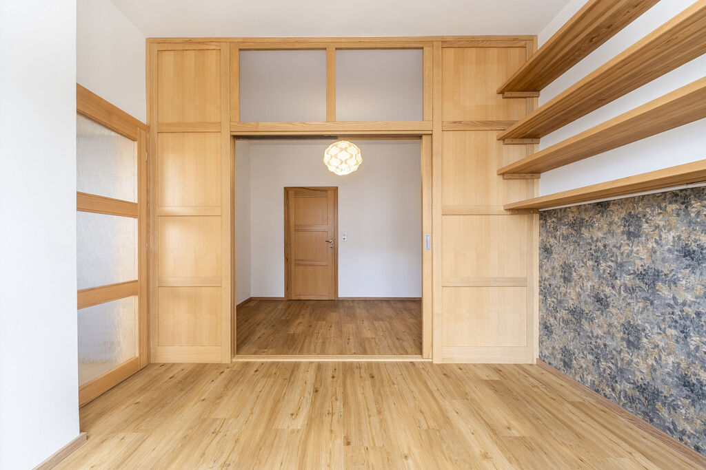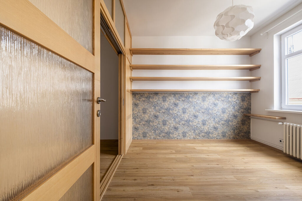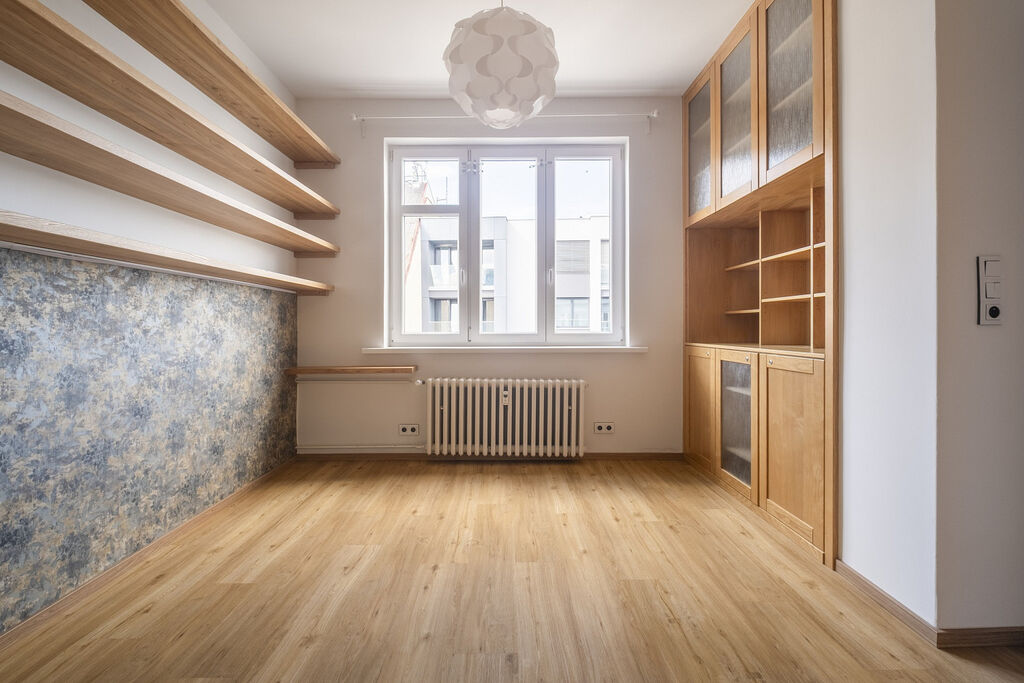 Exkluzivní nabídka družstevního bytu, který prošel kompletní rekonstrukcí. Byt se nachází ve 4.patře cihlového domu. Dům se nachází jen pár kroků od metra Palmovka. Samotný byt má 76 m², sklepní koje v suterénu domu má cca 2 m². Byt byl architektem upraven na chytře řešené 3+1 s prostorným dětským pokojem a 2 WC. Chodba je dostatečně široká, takže je zde prostor, pro umístění skříně či polic. Na podlahách kvalitní vinylová podlahová krytina. Dveře a zárubně jsou z jasanového masivu, rovněž tak jsou z jasanu vyrobené i šikovně řešené úložné prostory v obývacím pokoji. Centrální vytápění bytu. Ohřev teplé vody zajišťuje el. boiler. Na bytě vázne nesplacená anuita cca 610 tis., která se splácí v měsíčních poplatcích. Bytové družstvo v loňském roce provedlo zateplení střechy, což zlepšilo tepelný komfort v bytě. BD má příjem z pronájmu pozemku pro výdejní boxy.