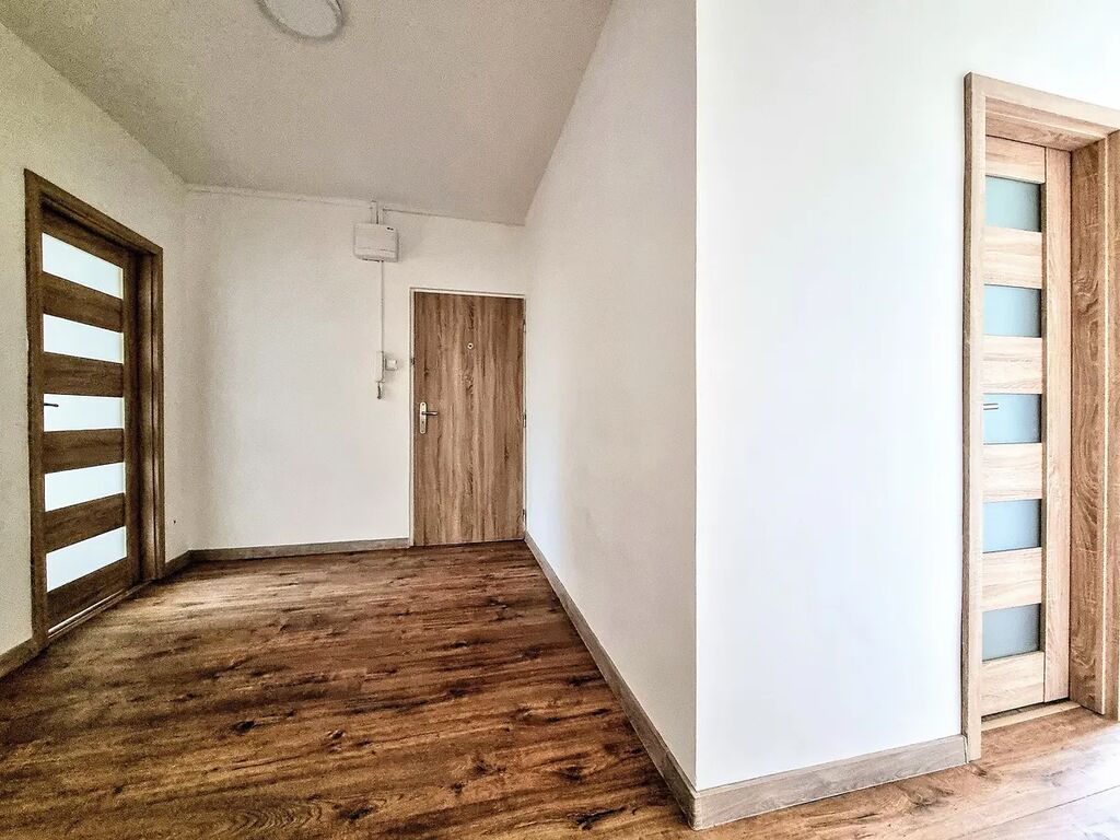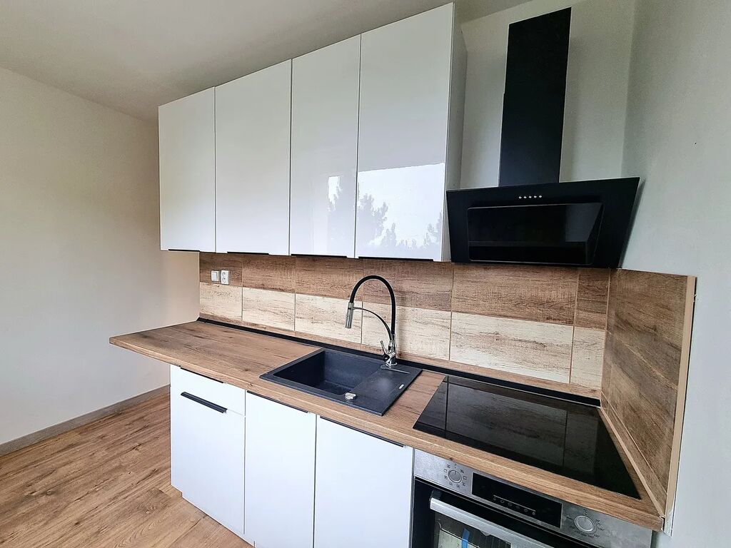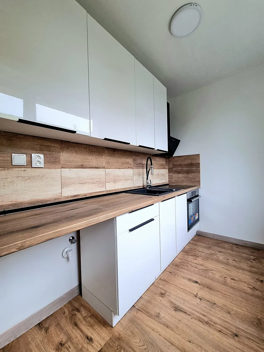 Interiér je krásně upravený v harmonickém duchu dřeva a bílé barvy, což vytváří příjemnou a klidnou atmosféru. Kuchyně je vybavena moderní bílou linkou, ideální pro vaše každodenní vaření a společné chvíle.