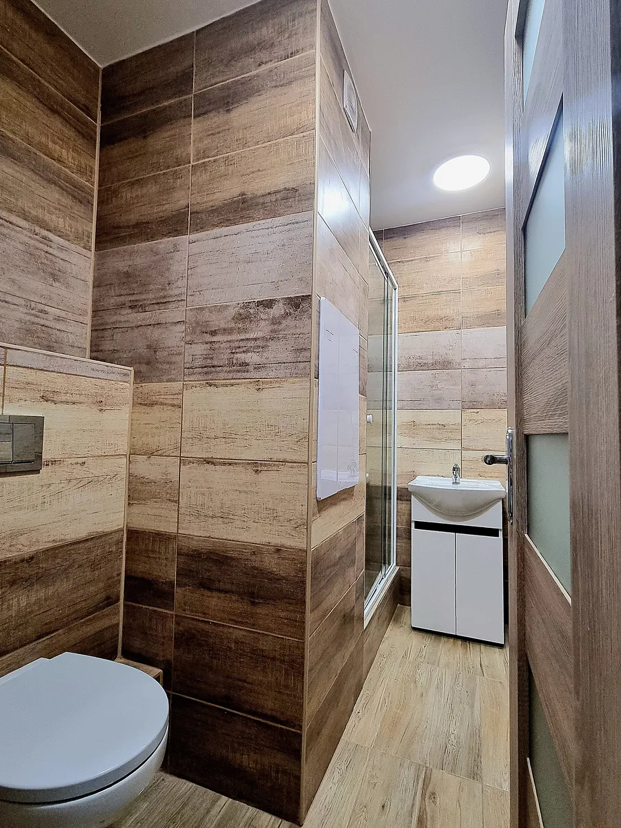 Koupelna s prostorným sprchovým koutem, umyvadlem a toaletou garantuje pohodlí a komfort.