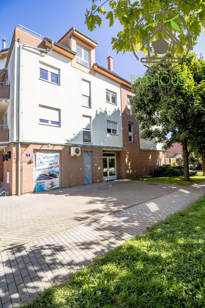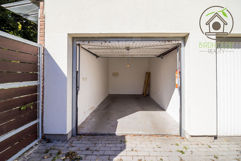 Součástí nabízeného bytu je garáž (14,17 m²) s úložným prostorem a elektřinou, což je v této lokalitě nezanedbatelná výhoda. Přesné rozměry garáže jsou Výška 2,73 m; Výška vjezdu 2,07 m; Šířka 2,69 m; Délka 5,27 m. Dále je součástí bytu také sklep (2,56 m²) a v suterénu domu je společná kočárkárna, kde lze uskladnit kolo či kočárek.