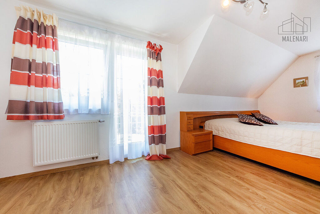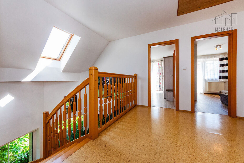 Z prosvětlené haly se po schodech dostaneme do prvního patra, kde jsou dva dětské pokoje (každý cca 15 m²), ložnice (cca 19,7 m²), koupelna (cca 8 m²) a samostatná toaleta (cca 2,2 m²). Ložnice má balkon se západní orientací (cca 4,6 m²) a dětské pokoje mají vstup na společnou terasu s jižní orientací (cca 19,1 m²).