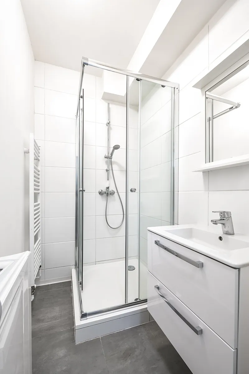 Prostorná vstupní chodba s kuchyňkou, pokoj se sprchou a umyvadlem, WC zvlášť.