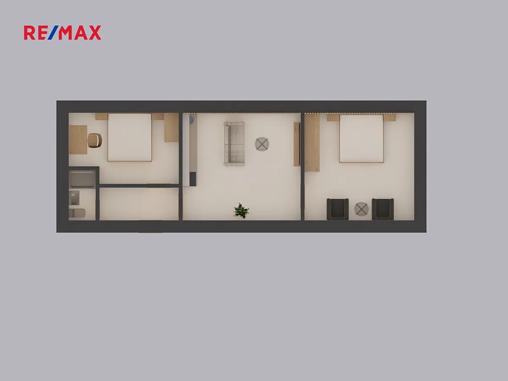 Současná dispozice nabízí vstupní předsíň, prostorný obývací pokoj oddělený částečnou příčkou od ložnice, samostatnou kuchyni se spotřebiči a koupelnu se sprchovým koutem a WC.