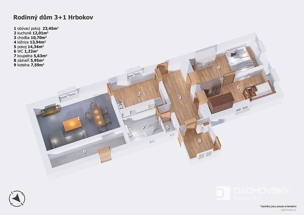Přízemí (1. NP): vstupní chodba, kuchyň, obývací pokoj, dva samostatné pokoje, koupelna, toaleta, technické zázemí (kotelna) a vstup do sklepa (cca 6 m²)