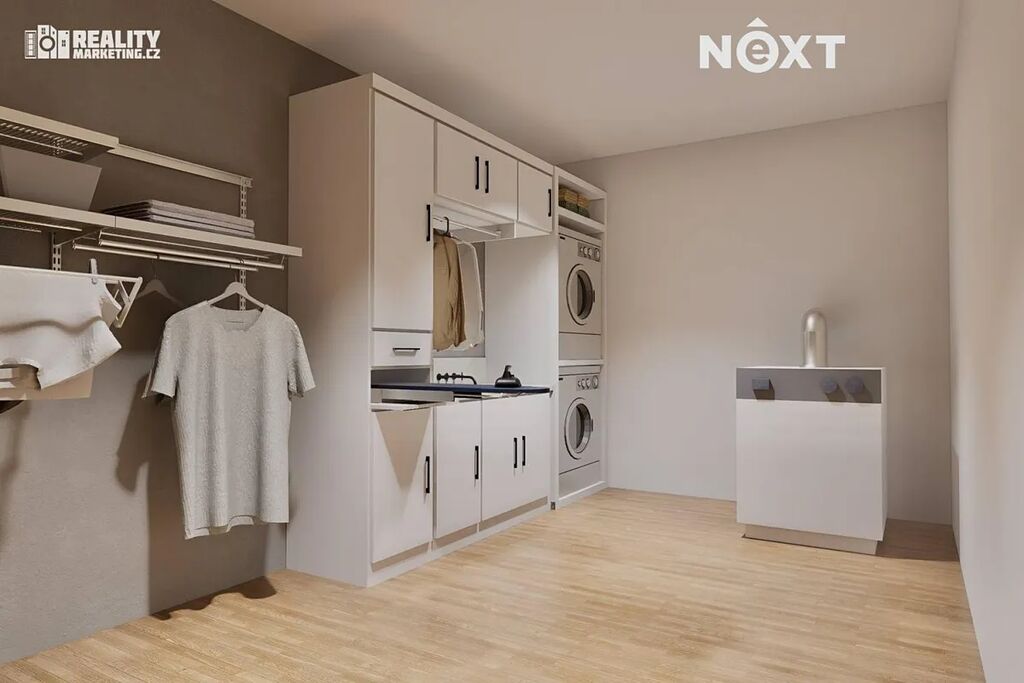 • Přízemí: prostorný obývací pokoj s kuchyňským koutem a vstupem francouzskými dveřmi na terasu a zahradu, technická místnost s kotlem a bojlerem (současně příprava na prádelnu a WC), chodba s propojením do garáže.