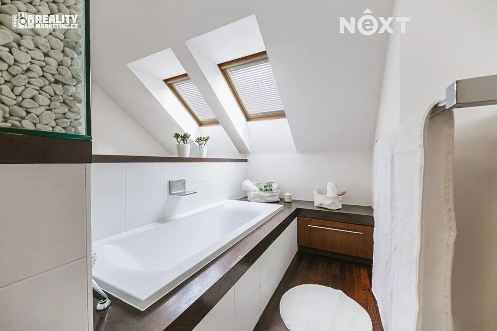 V patře najdete master suite – ložnici s klimatizací, dvě šatny na míru a wellness koupelnu s vanou, sprchovým koutem, dvěma umyvadly a podlahou z dřeva Wenge. Další dva pokoje mají vlastní šatny a přístup na terasu.