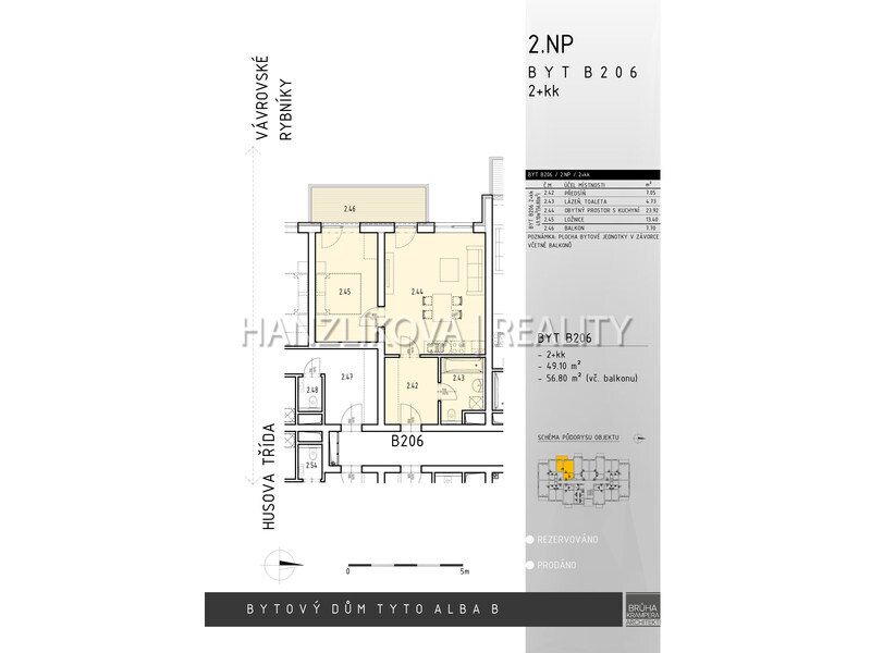 Nabízíme k pronájmu bytovou jednotku o dispozici 2+kk (byt číslo B.206) s terasou v klidné okrajové části města, na okraji sídliště Vltava, v těsné blízkosti lesa a Vrbenských rybníků. Byt se nachází ve 2.NP zděného bytového domu s výtahem. Bytová jednotka má výměru 49,10 m2 + balkon 7,70 m2 a skládá se z: předsíně s chodbou, koupelny s toaletou, ložnice, obývacího pokoje s kuchyňským koutem, ze kterého je vstup na terasu. Byt je kromě kuchyňské linky se spotřebiči (myčka, sporák, mikrovlnka, varná deska - indukce) nezařízený. Dům se nachází na hezkém, klidném místě, s příjemným výhledem do zeleně. Dále se v blízkosti nachází přírodní rezervace Vrbenské rybníky, kde najdete turistické stezky, které také slouží jako cyklostezky. Kousek od domu jsou zastávky MHD(9,14,15), nákupní centrum „Géčko“ a veškerá občanská vybavenost (vše ve vzdálenosti 5–10 minut chůze nebo 2 minuty autem). V přízemí domu je společná kolárna. V ceně nájmu je parkovací stání. Pronájem bez domácích mazlíčků. Byt bude k dispozici od 1.11.2025.