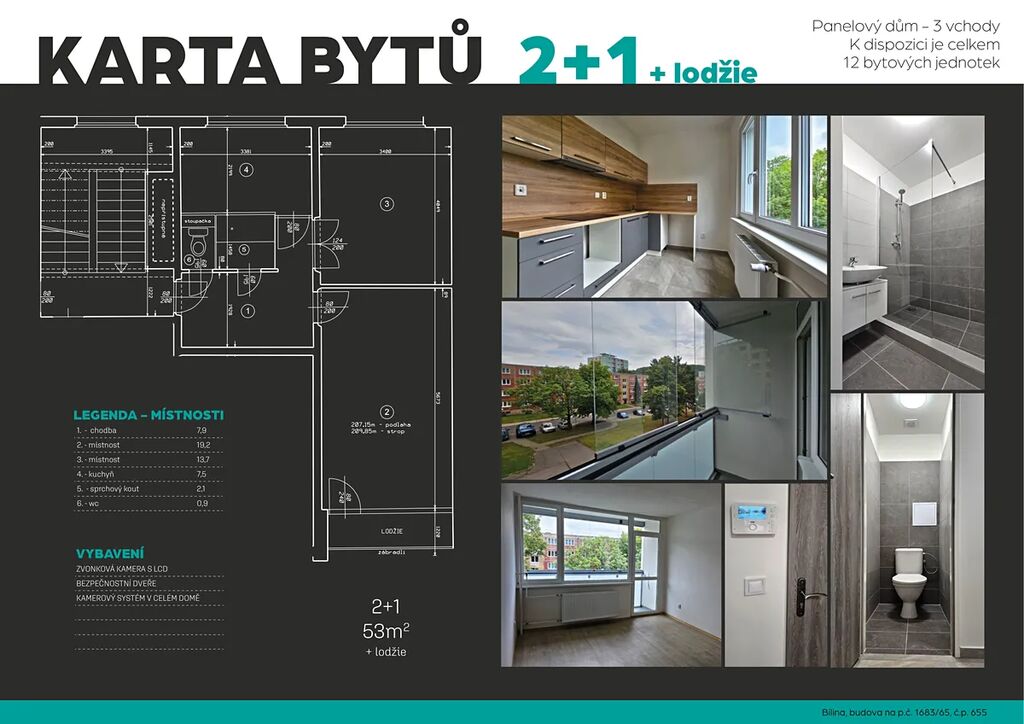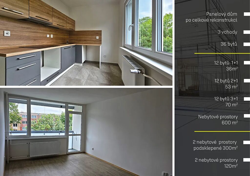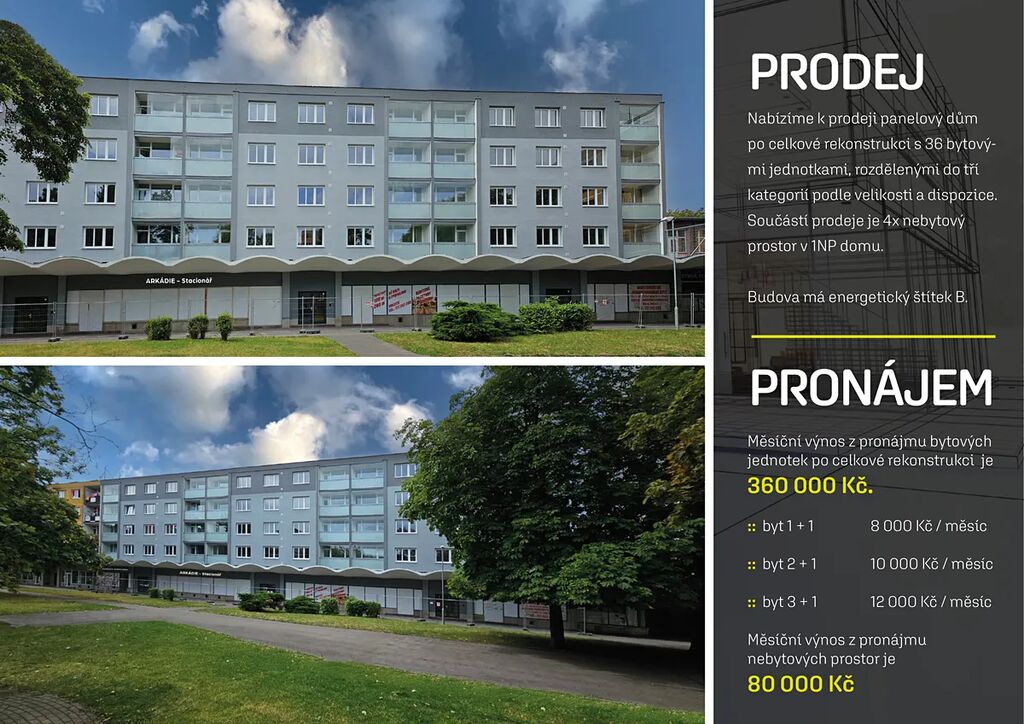 Nabízíme k prodeji nově zrekonstruovaný panelový dům s 36 bytovými jednotkami o velikosti 12 x 3+1, 12 x 2+1 a 12 x 1+1 s celkovou obytnou plochou 1908 m2 se čtyřmi nebytovými prostory o velikosti 600 m2. Dům i jednotlivé vchody jsou vybaveny nadstandartními prvky, kdy každý byt má: