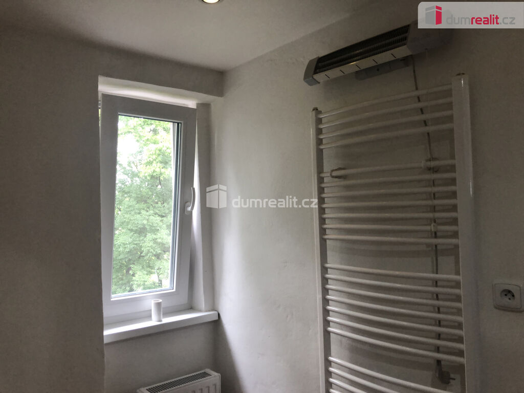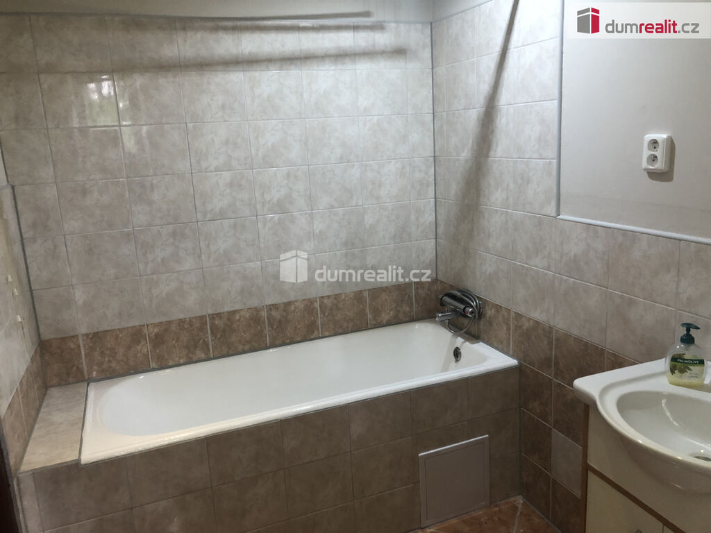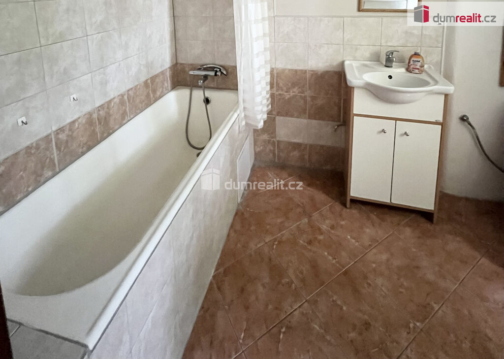 Velká koupelna s oknem společná s WC, vana, umyvadlo.
