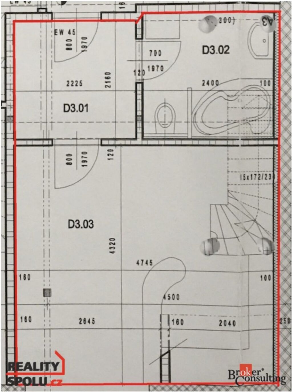 ve spodní části se nachází prostorný obývací pokoj s kuchyňským koutem a koupelna s rohovou vanou,