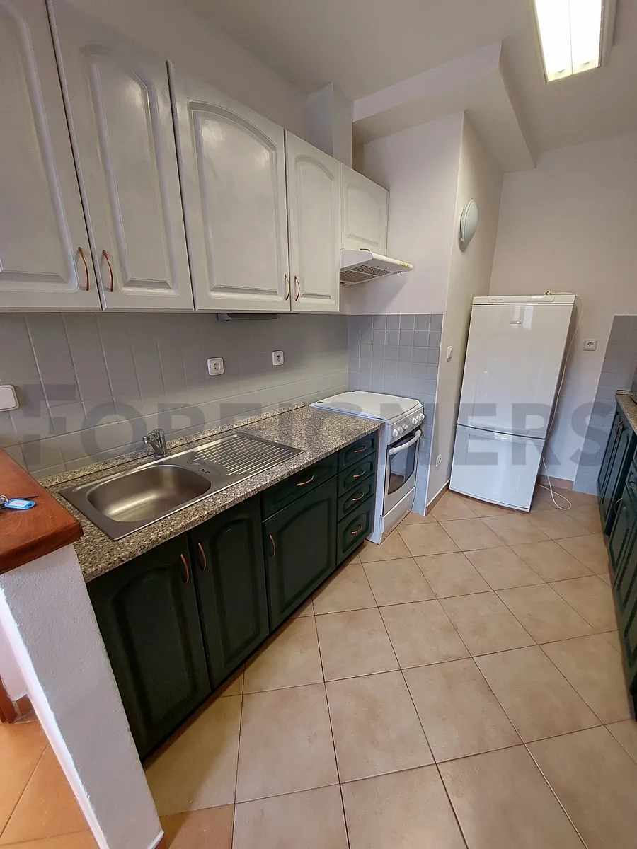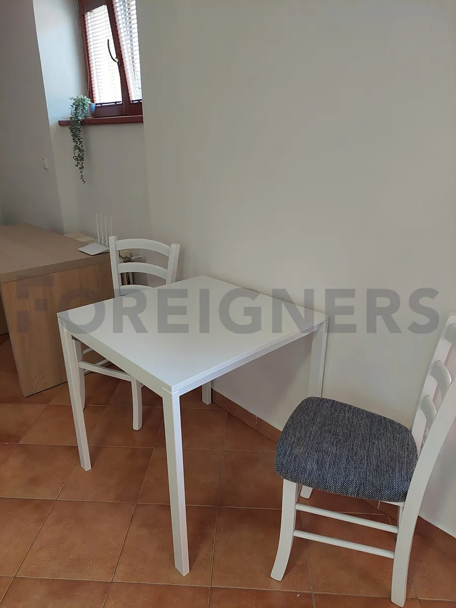 - V kuchyni najdete kuchyňskou linku s plynovým sporákem, digestoří, mikrovlnou troubou, ledničkou, jídelním stolem a židlí.