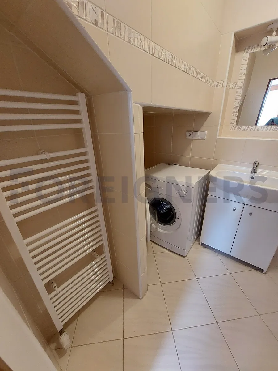 - Koupelna se sprchou, pračkou a umyvadlem se zrcadlem; WC je oddělené.