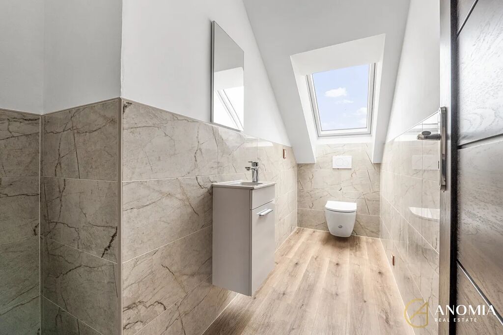 Byt se nachází v cihlovém domě, přístup do jednotky je umožněn samostatným vstupem přímo z ulice. Byt je mezonetový - v přízemí se nachází vstupní hala se šatnou pod schodištěm a vstupem do zahrady. V prvním patře pak najdete obývací pokoj s kuchyňským koutem, dva neprůchozí pokoje, koupelnu s vanou, samostatnou toaletu a technickou místnost s plynovým kondenzačním kotlem. Byt je částečně vybavený - budoucím nájemníkům je v bytě k dispozici kromě kuchyňské linky i jídelní kout a sedací souprava. Byt prošel v posledních měsících citlivou a vkusnou rekonstrukcí. Majitel při rekonstrukci volil kvalitní materiály, využil moderních technologií a zároveň zrenovoval původní odhalené dřevěné trámy, které v celém prostoru umocňují útulnou rodinnou atmosféru. Bytová jednotka je připravena pro vůbec první nájemníky, všechny spotřebiče jsou tedy zcela nové a bez jakéhokoliv opotřebení. K pohodlí v každém ročním období přispívá instalovaná klimatizace.