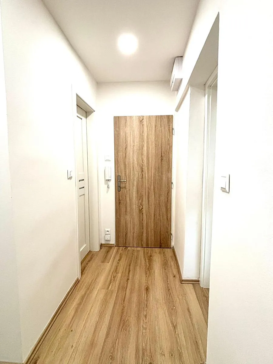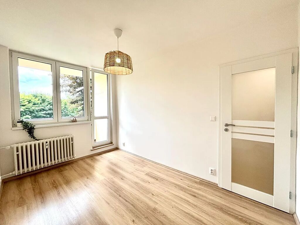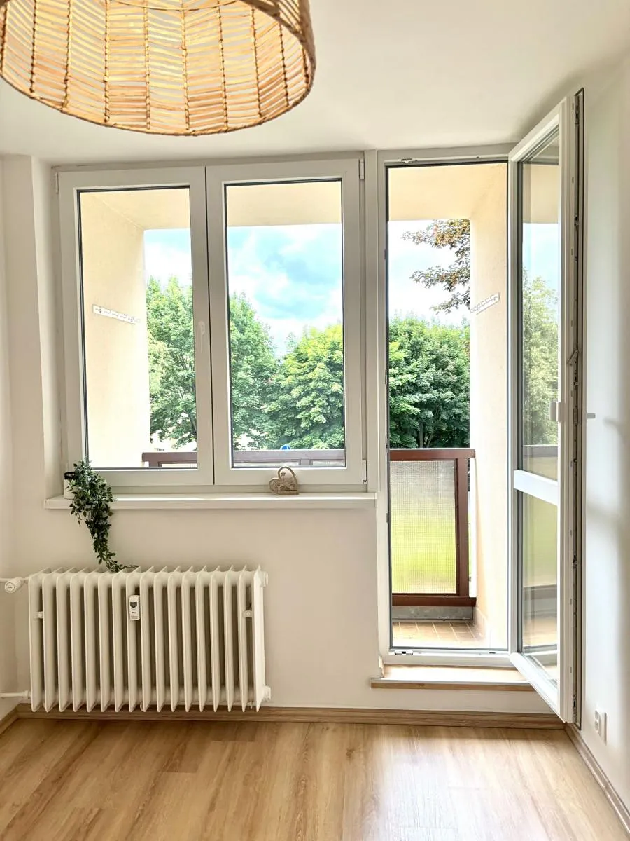 Součástí bytu je balkón s výhledem do zeleně a sklepní kóje, která poskytuje praktický úložný prostor. Byt prošel částečnou rekonstrukcí nové podlahy, moderní koupelna s toaletou, nová výmalba i designové osvětlení. Dominantou bytu je prostorný obývací pokoj s kuchyňským koutem a výhledem do klidné zeleně. Je zde nová menší kuchyňská linka se zabudovanou troubou a plynovým sporákem. Druhý pokoj lze využít jako ložnici nebo pracovnu. Interiér je laděn do přírodních tónů a doplněn o stylové prvky jako jsou dřevěné doplňky a rostliny.