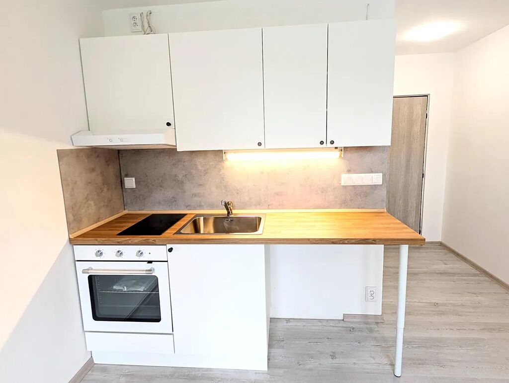 Interiér prošel kompletní rekonstrukcí a působí svěže, moderně a vzdušně. Kuchyňská linka je vybavena elektrickou troubou, sklokeramickou varnou deskou, digestoří a nerezovým dřezem. Pracovní deska v dekoru dřeva ladí s podlahovou krytinou, celkové ladění je minimalistické a funkční.
