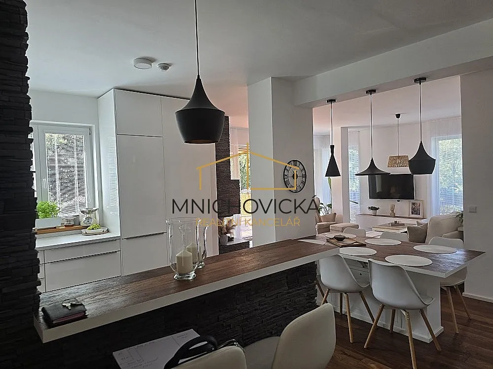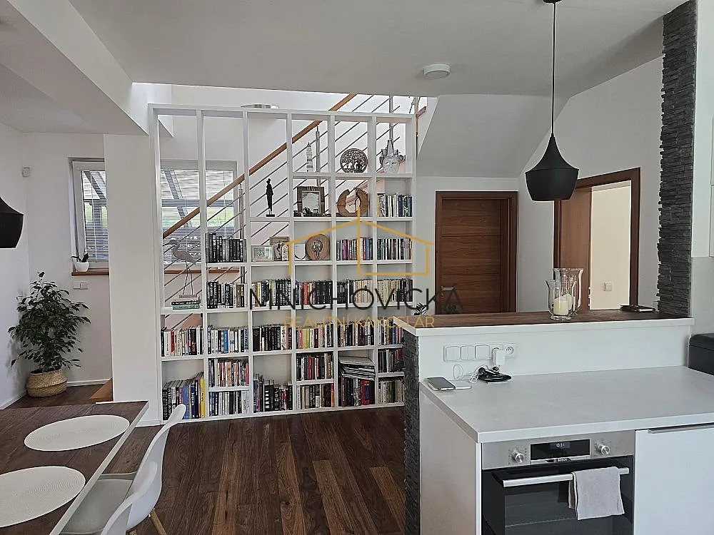 Celé přízemí je otevřené, světlé, dispozičně velmi zajímavě řešené, s výstupy na prostornou terasu 60 m2, zhotovenou z velmi tvrdého, tropického dřeva Garapa. V obývacím pokoji nechybí moderní krb, vytápění domu zajišťuje plynový kotel s napojením v přízemí na podlahové vytápění, v patře na radiátory, centrálně ovládané prostřednictvím aplikace např. přes mobilní telefon.
