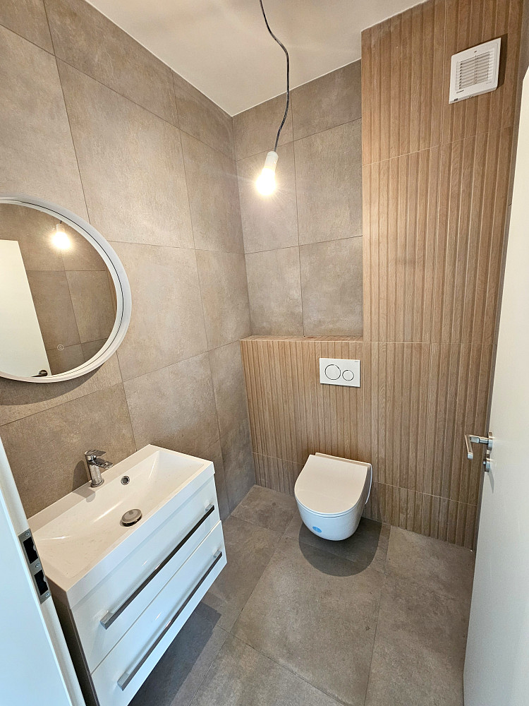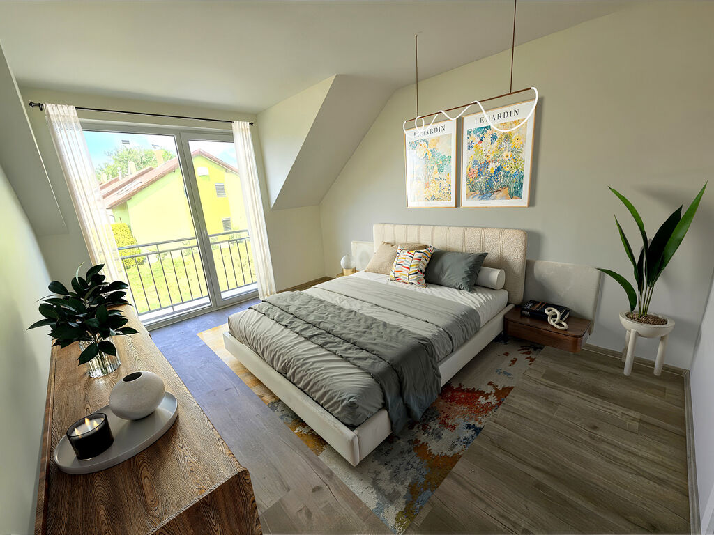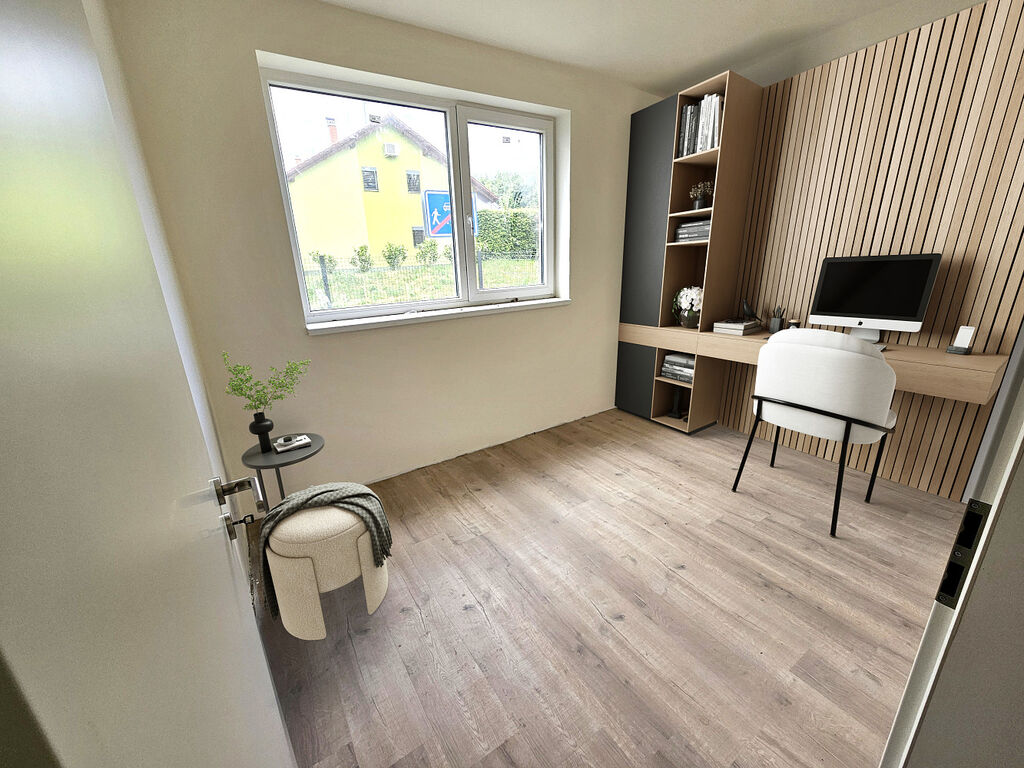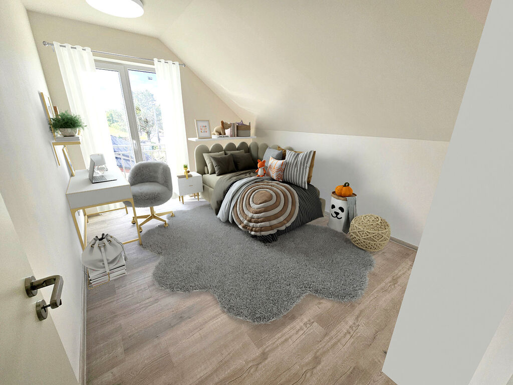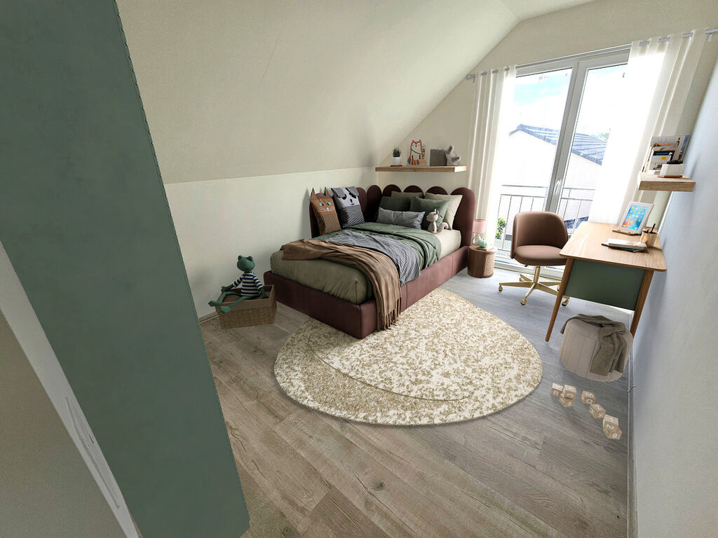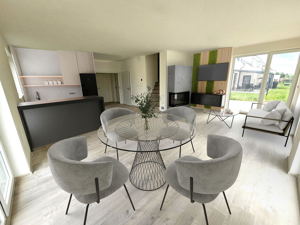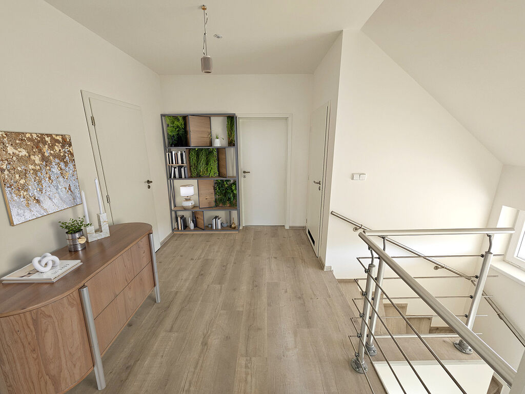 Přízemí, s obývacím pokojem a kuchyní spojenými s terasou a zahradou francouzskými okny, tvoří srdce domu. Prostorná a slunná místnost udržuje obyvatele v centru dění. V přízemí se rovněž nachází technická místnost, pracovna, toaleta a zádveří. Horní patro poskytuje maximální soukromí celé rodině. V hlavní ložnici obyvatelé jistě ocení šatnu. Dále zde najdeme dva dětské pokoje. V koupelně se nachází sprchový kout i vana. WC je samostatné.