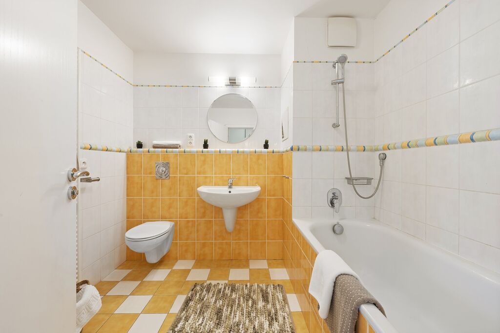Koupelna s WC (5,16 m²) je prostorná, vybavená vanou, umyvadlem, WC a pračkou. Díky svému uspořádání působí komfortně a funkčně.