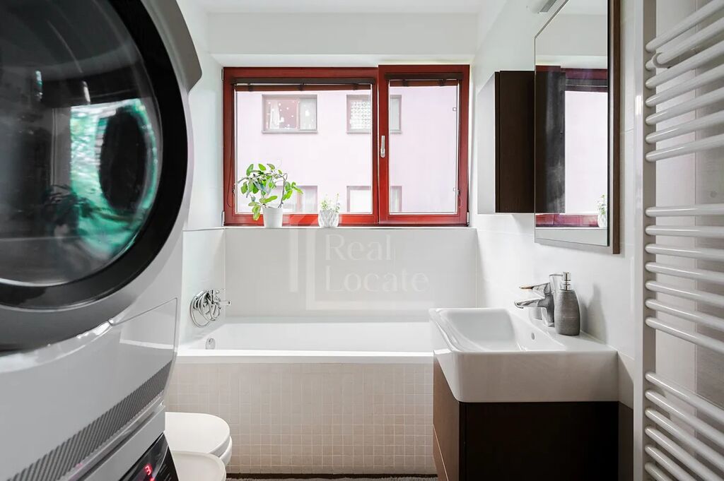 Součástí vybavení je moderní kuchyňská linka s vestavěnými spotřebiči – myčka, trouba, varná deska, mikrovlnná trouba a lednice. Koupelna je vybavena vanou, nechybí ani dvě samostatné toalety.