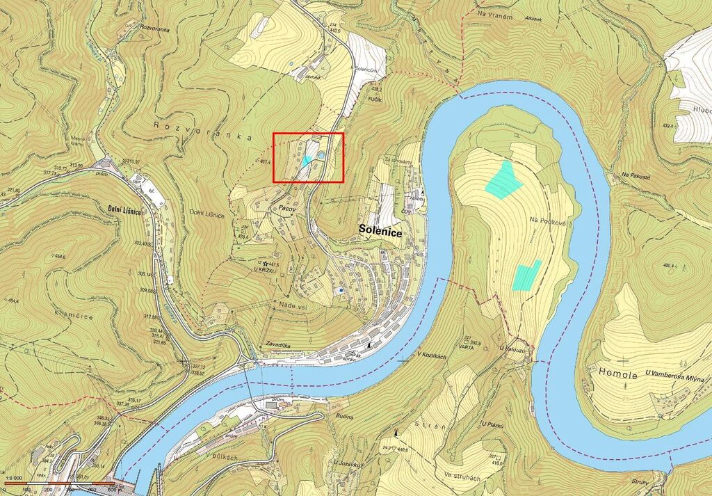 Pozemek se nachází v klidné části obce Solenice, poblíž Orlické přehrady (cca 1 km od hráze), která nabízí možnosti rekreace a vodních sportů. Obec poskytuje základní občanskou vybavenost, okresní město Příbram je vzdáleno cca 17 km. Lokalita kombinuje přírodní prostředí s dostupností služeb a dopravní dostupností.