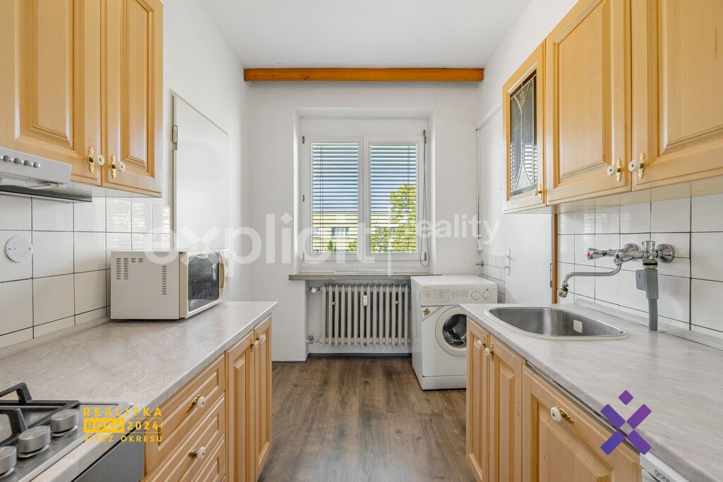 Z chodby se vchází do kuchyně je vybavena elektrickou troubou v kombinaci s plynovým sporákem, lednicí, mikrovlnou troubou a součástí kuchyně je i pračka.