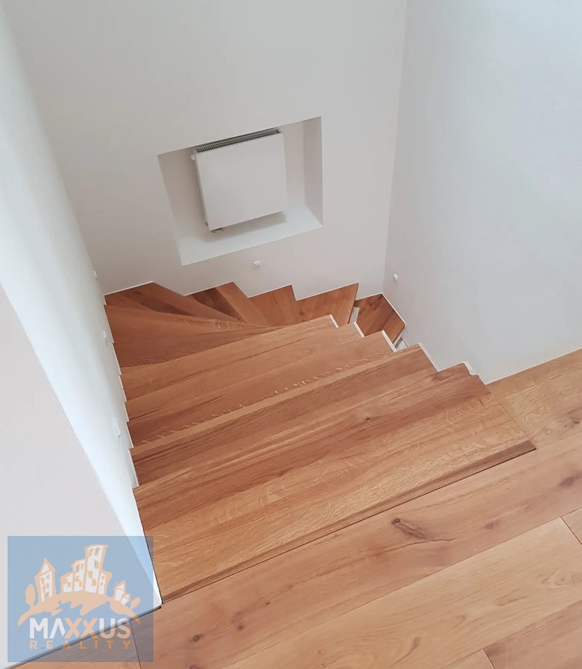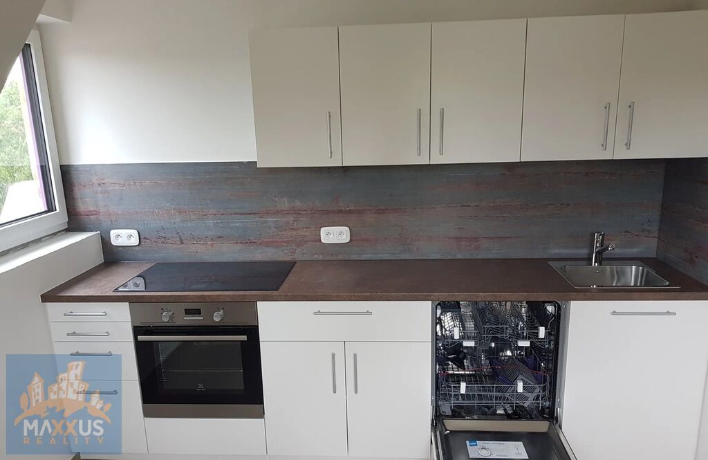 Kuchyně je vybavena 60 cm širokou myčkou, 80 cm širokou indukční deskou AEG a troubou, vysokou lednicí a prostornou potravinovou skříní. Koupelna s dvojumyvadlenm vanou se sprchovým sloupem a zástěnou, bidetem a WC. Pračku se sušičkou je možné umístit v koupelně. Z celého bytu je výhled na všechny 4 světové strany. Topení budou v topné sezóně zajišťovat decentní nástěnné radiátory a příjemné podlahové topení v koupelně i v části kuchyně. Plynové vytápění. Netradiční atmosféru bydlení doplňují přiznané dřevěné kleštiny pod stropem.