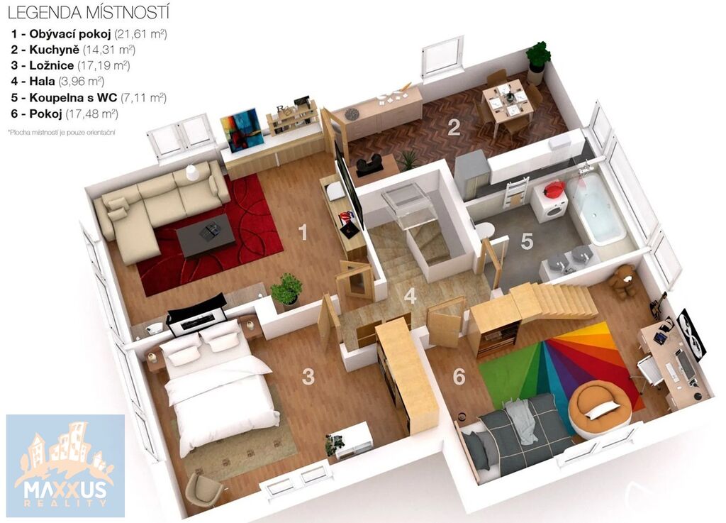 Samostatný vchod vede do vstupní haly, kde je ideální prostor na přezutí a odložení svršků do prostorné skříně. Po schodech se vyjde do patra, kde se nachází propojovací chodba mezi 4 hlavními místnostmi - koupelnou, dětským pokojem, ložnicí a obývacím pokojem. Z příjemného obývacího pokoje s cihlovou stěnou je průchod do kuchyně.