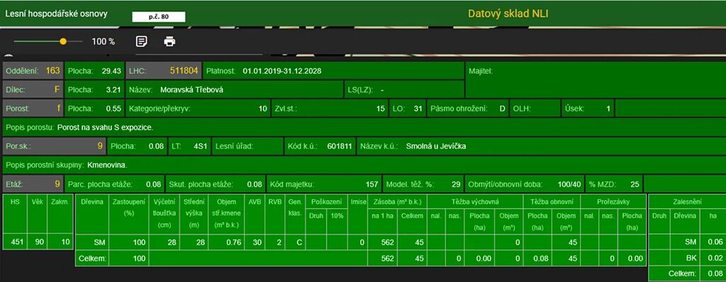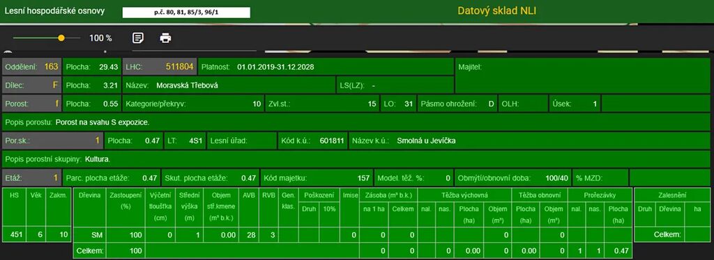 Jedná se o p.č. 80 vedená jako lesní pozemek o celkové výměře 3 054 m2, p.č. 81 vedená jako lesní pozemek o celkové výměře 1 349 m2, p.č. 85/3 vedená jako lesní pozemek o celkové výměře 739 m2, p.č. 96/1 vedená jako lesní pozemek o celkové výměře 327 m2.