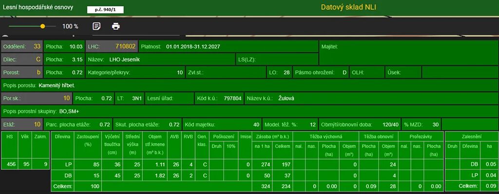 Jedná se o parcelu č. 940/1 vedená jako lesní pozemek o celkové výměře 7 198 m2, vlastníme podíl 3/4 tudíž výměru 5 399 m2.
